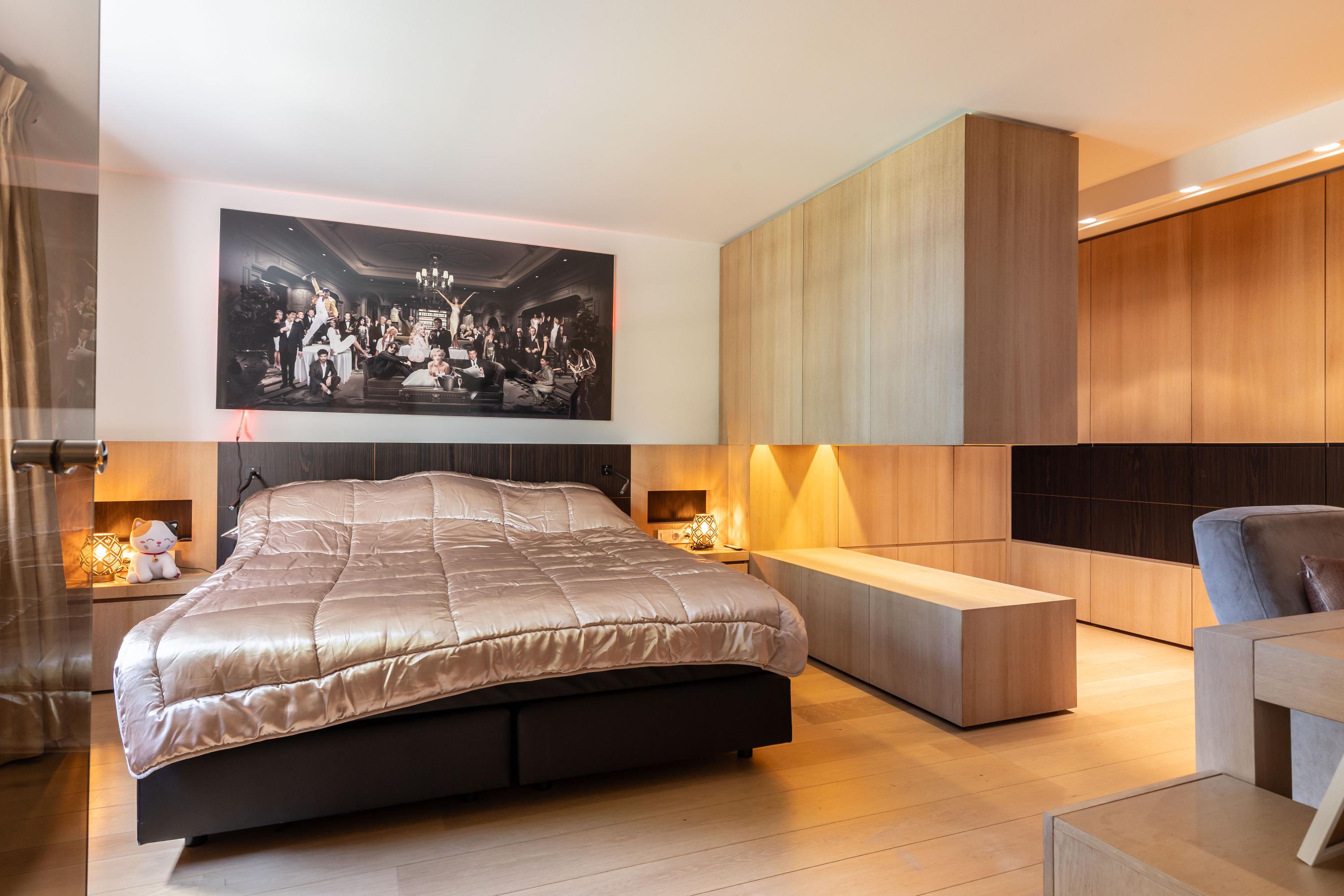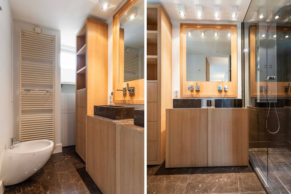 Drie grote slaapkamers bieden eveneens luxe maatwerk; één ervan heeft toegang tot een eigen dakterras. Op de overloop is een tweede badkamer met dubbele wastafel, inloopdouche, bidet en apart toilet.