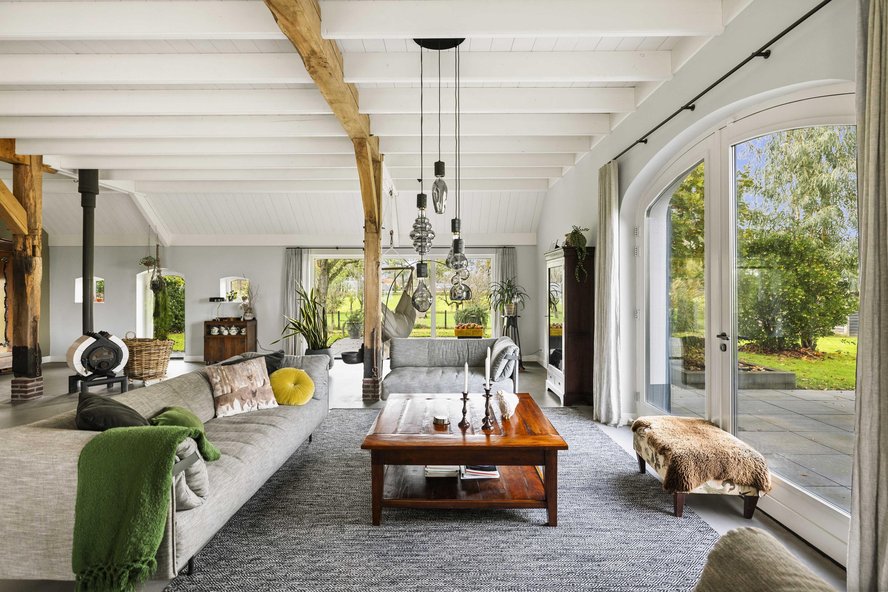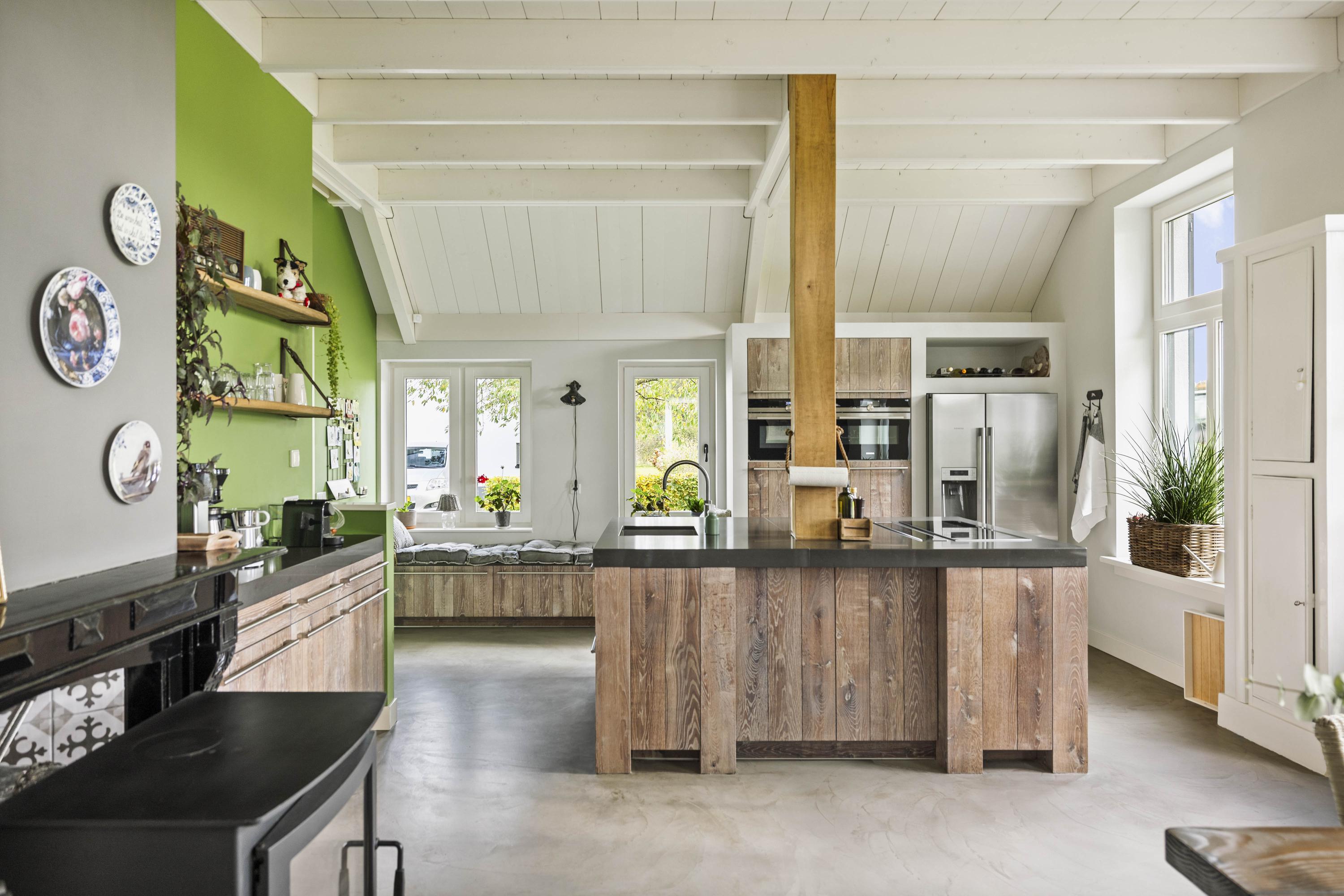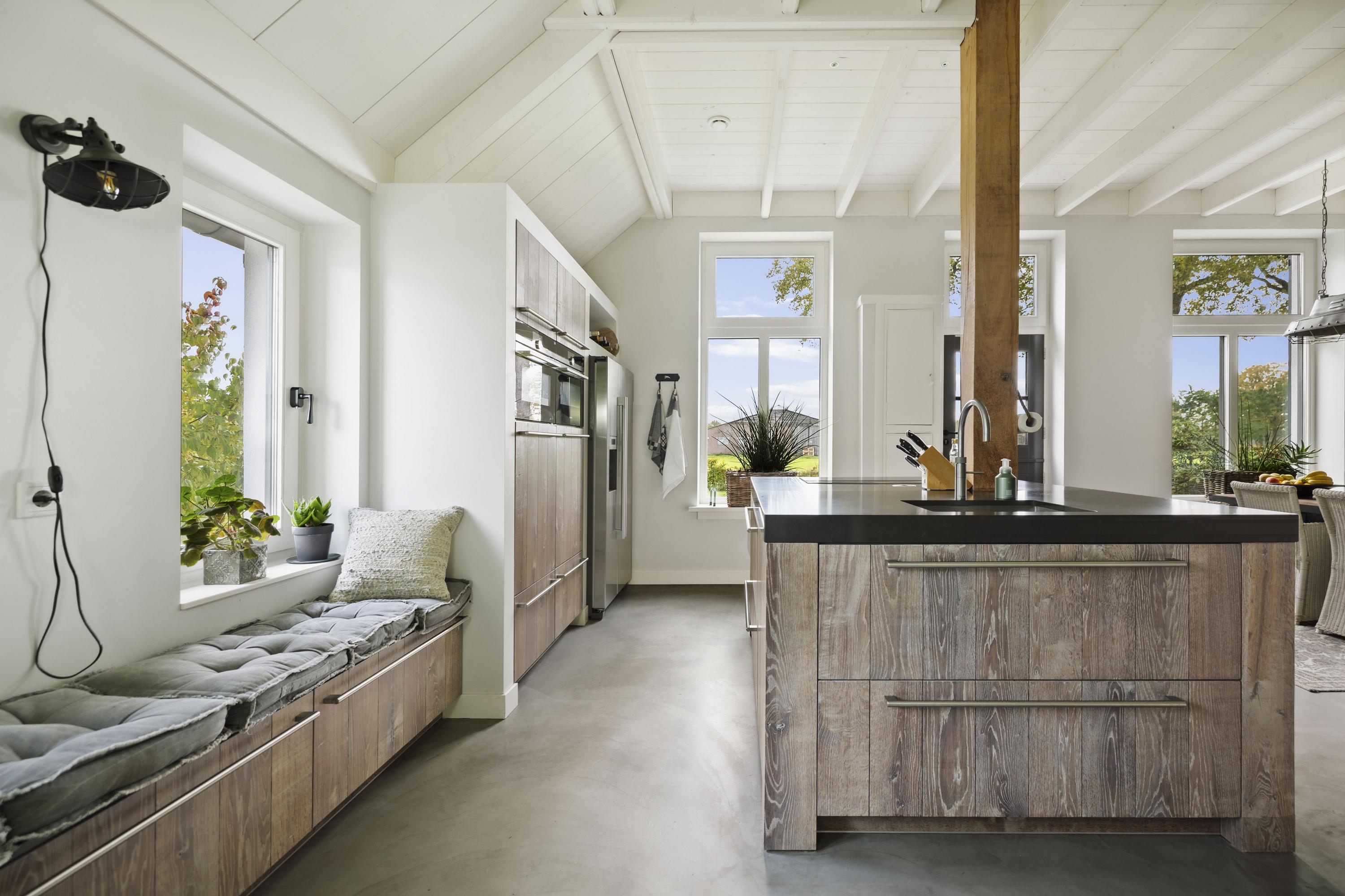 De keuken is maatwerk van Scheffer Keukens Zelhem en is ronduit indrukwekkend; met een dik, composiet werkblad, robuuste massief eiken fronten en alle moderne inbouwapparatuur – van inductieplaat tot Quooker - is het een heerlijke plek om je als chef-kok uit te leven. In de oude schouw staat nog een stoere Nordic Fire-houtkachel, die de keuken voorziet van extra sfeer en warmte.