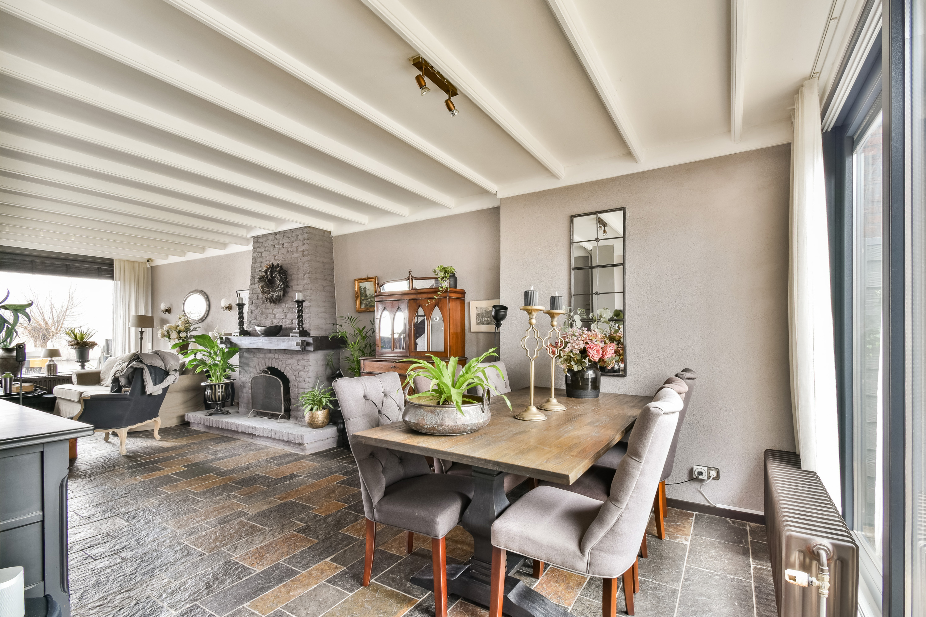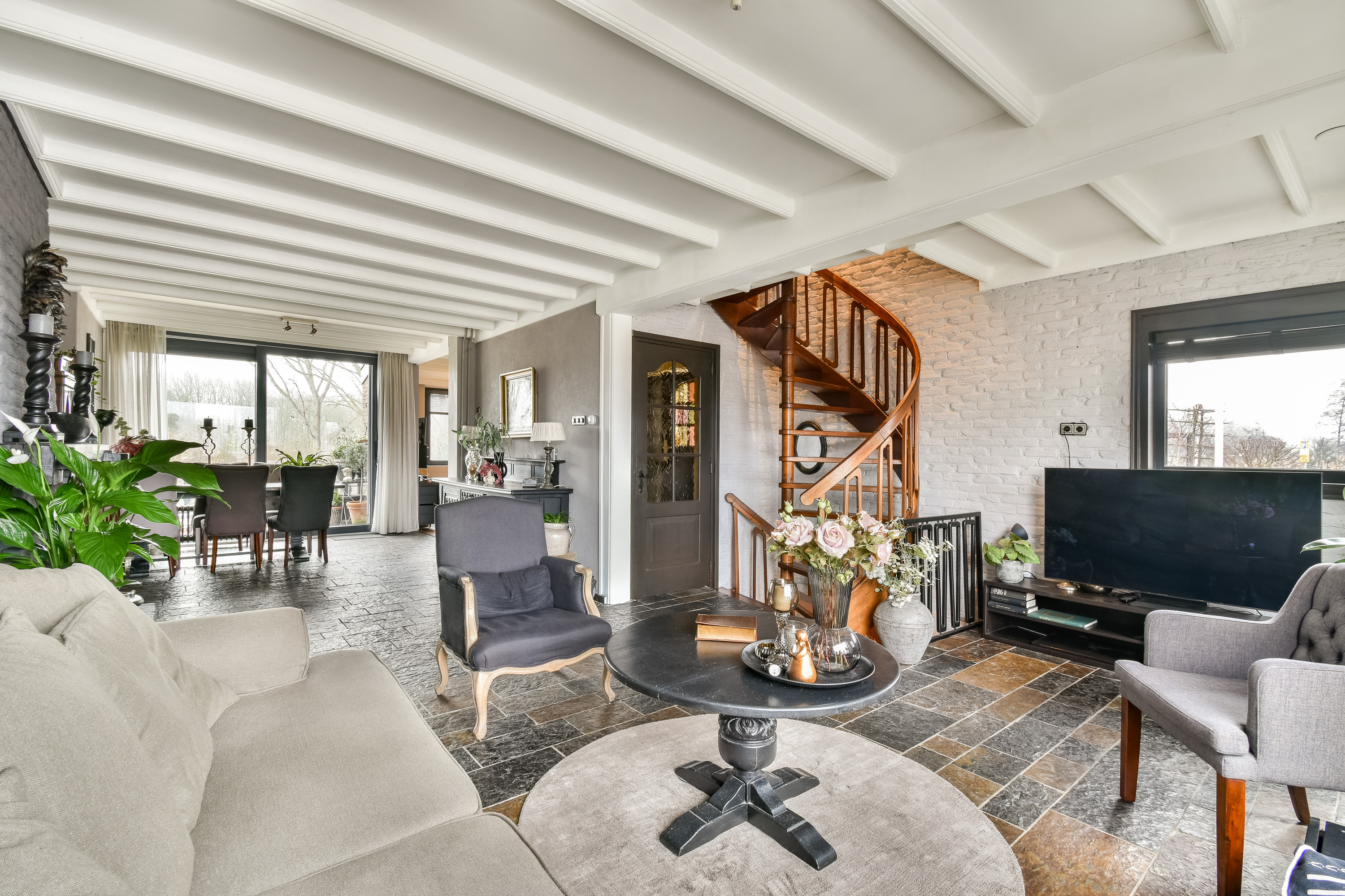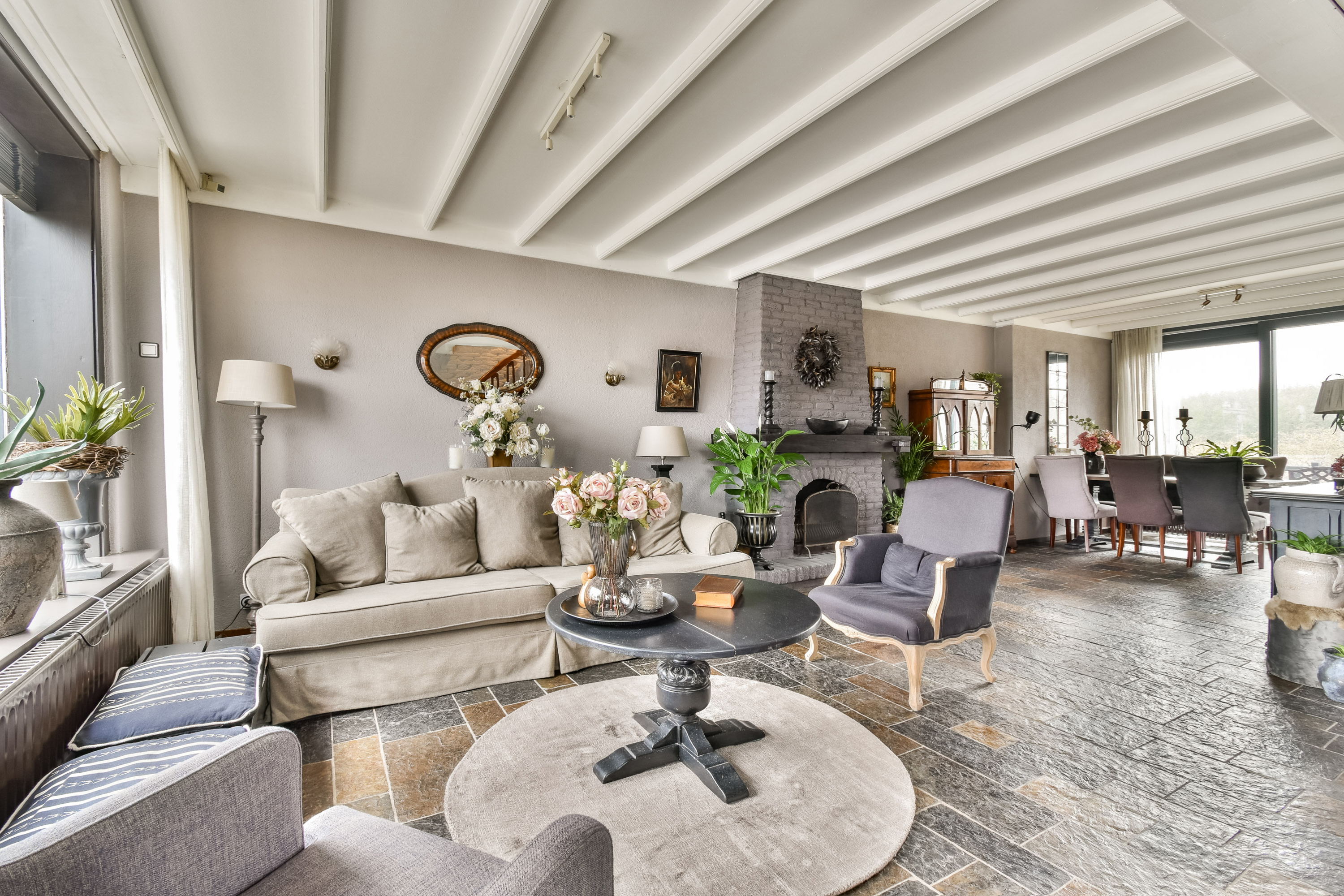 De sfeervolle woonkamer aan de voorzijde is heerlijk licht dankzij de grote raampartijen en is voorzien van een gezellige open haard en vloerverwarming. Vanaf de zithoek heb je een prachtig uitzicht over de Rotte.