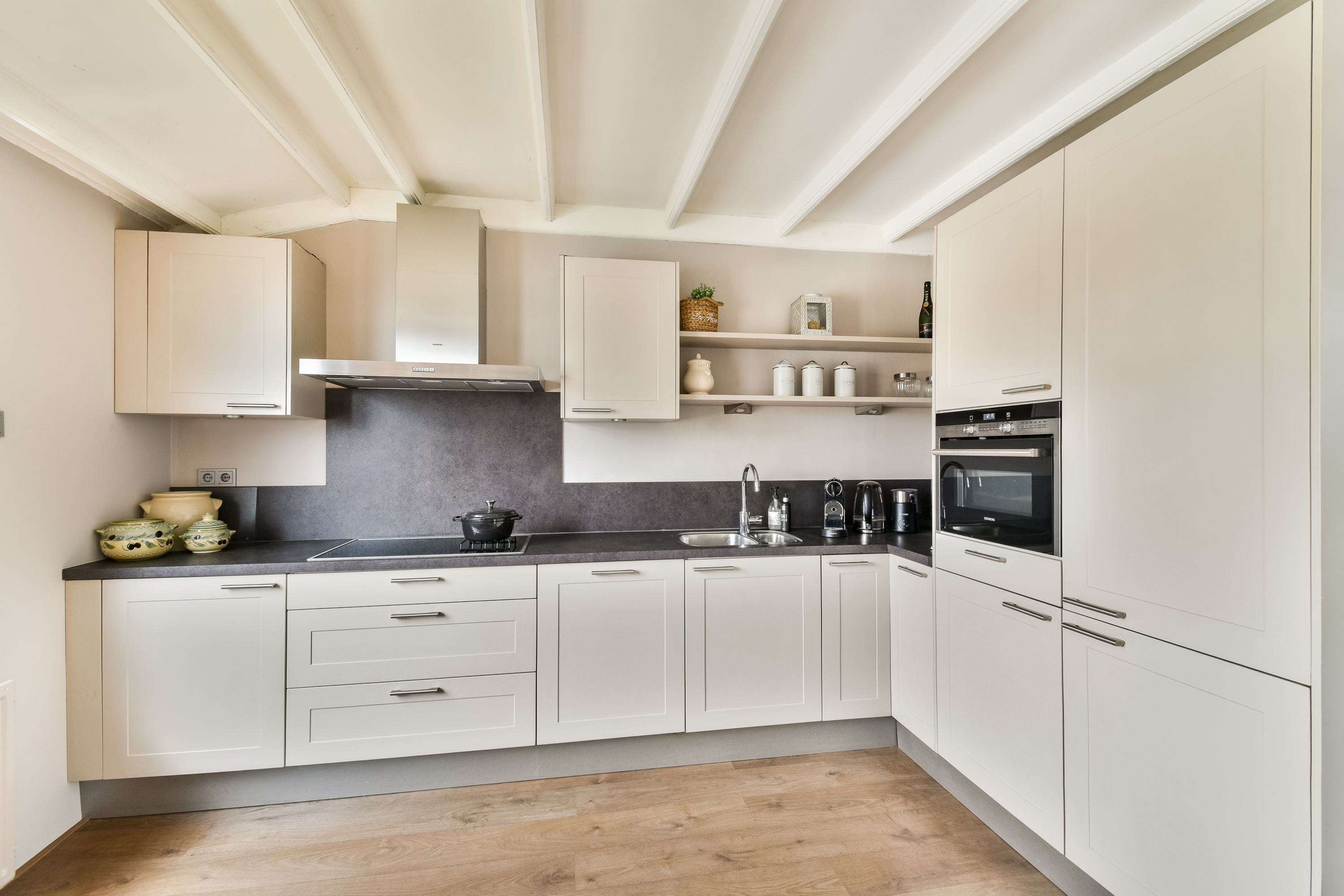 De moderne keuken is aan de voorzijde gelegen, uitgevoerd in een L-opstelling en voorzien van diverse inbouwapparatuur, waaronder een vaatwasser, combi-oven, koel-vriescombinatie, inductiekookplaat en afzuigkap.