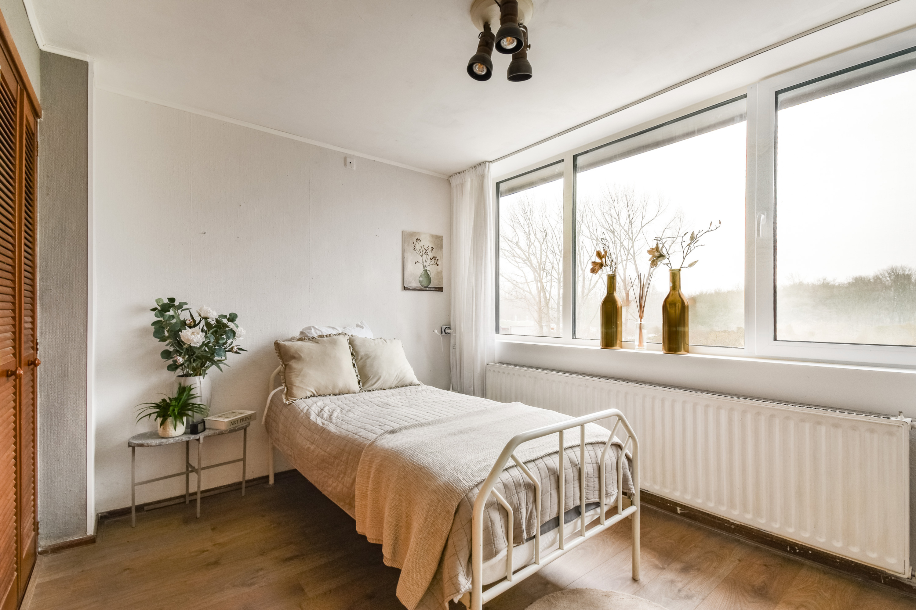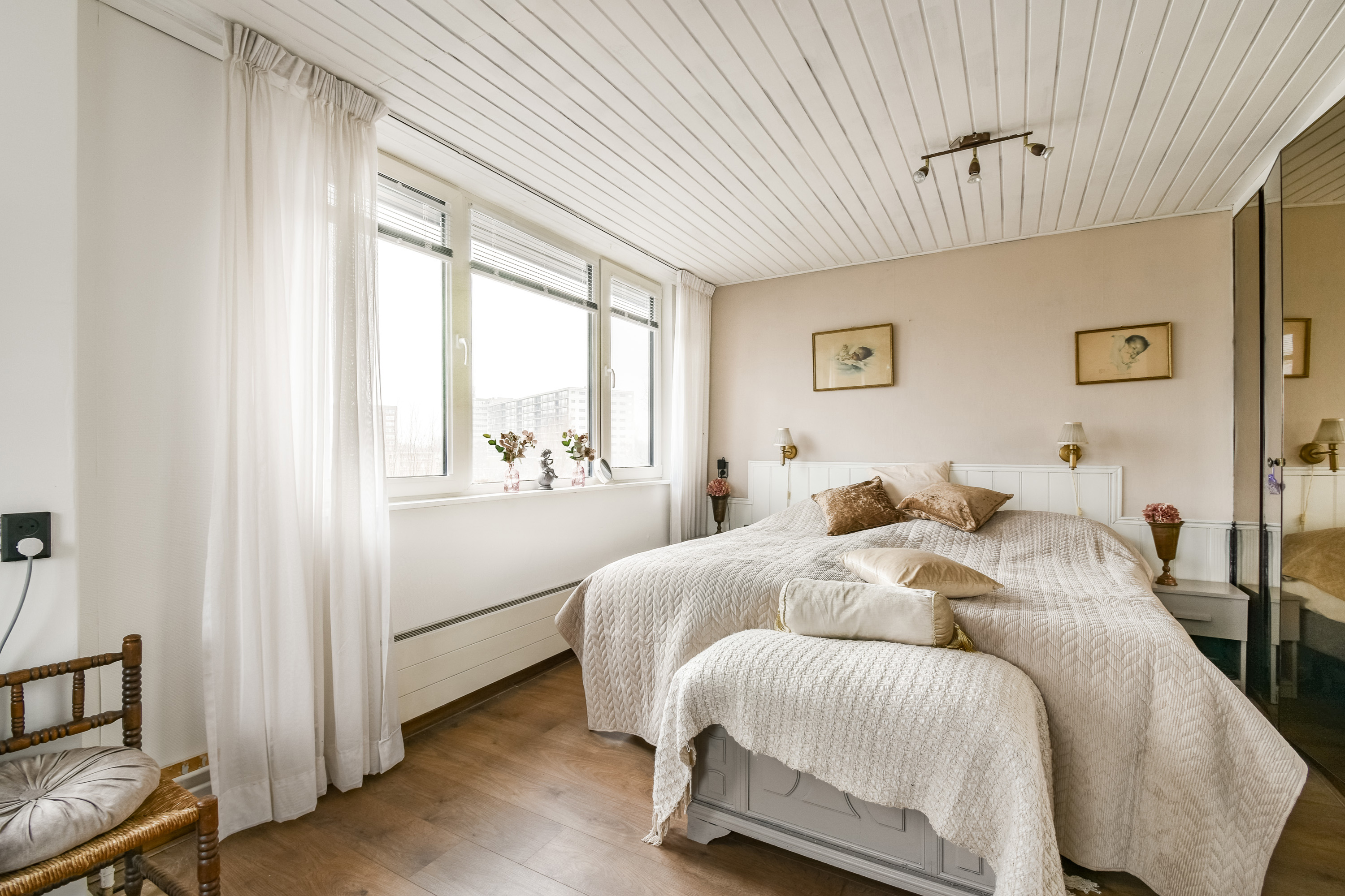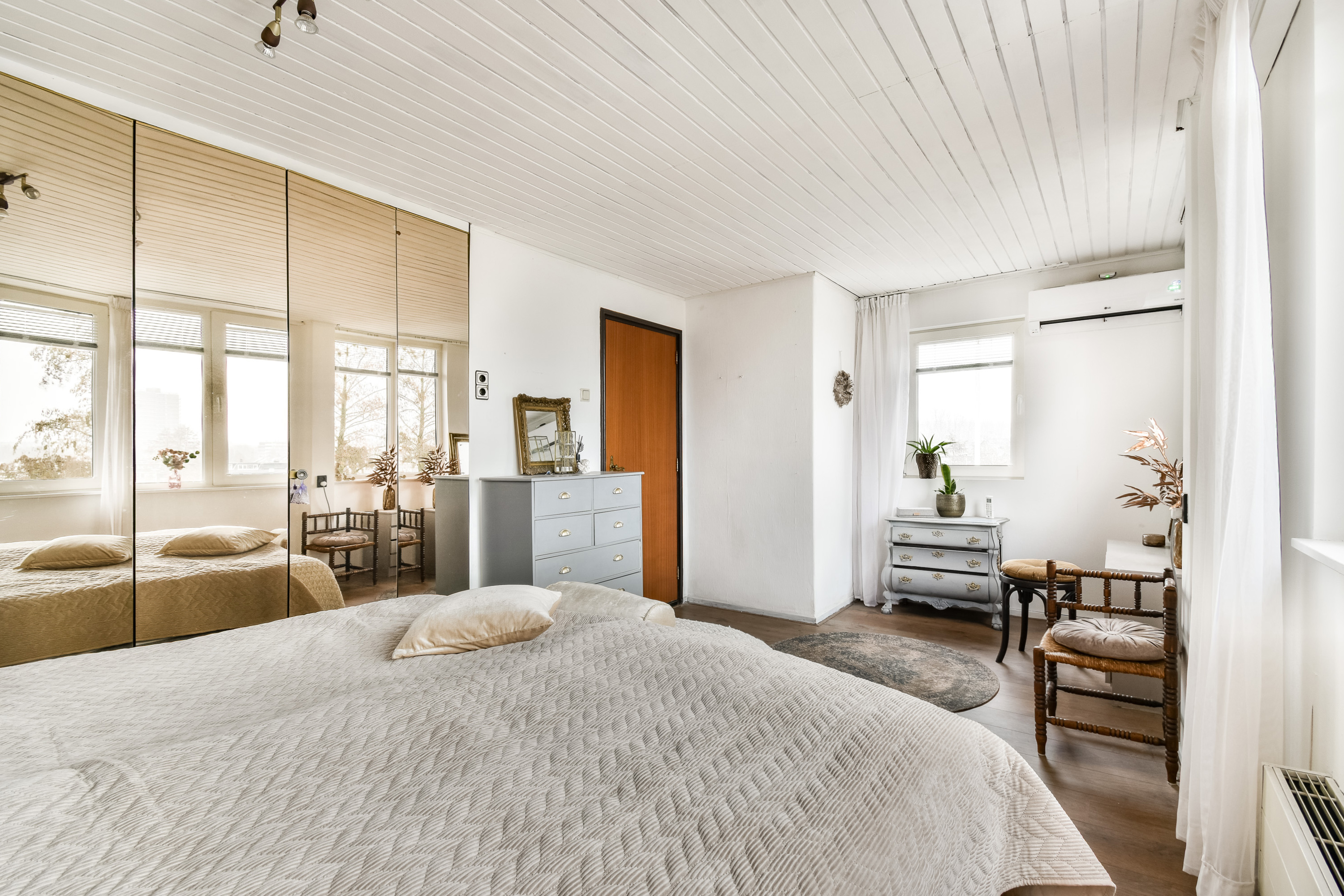 Slaapkamer 1, gelegen aan de voorzijde, voorzien van vaste kasten en airconditioning, met een prachtig uitzicht over de Rotte.