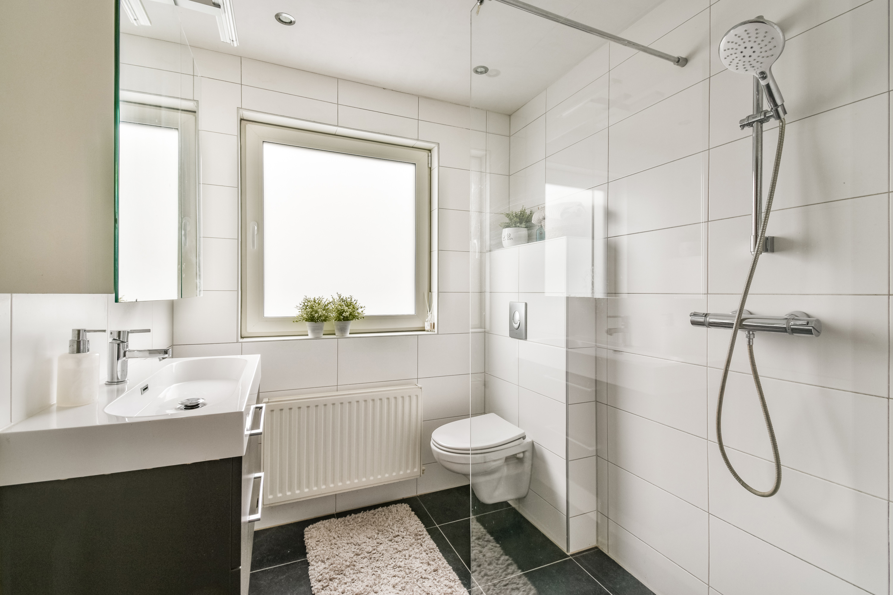De badkamer is uitgerust met een douche, wastafel, toilet en vloerverwarming.