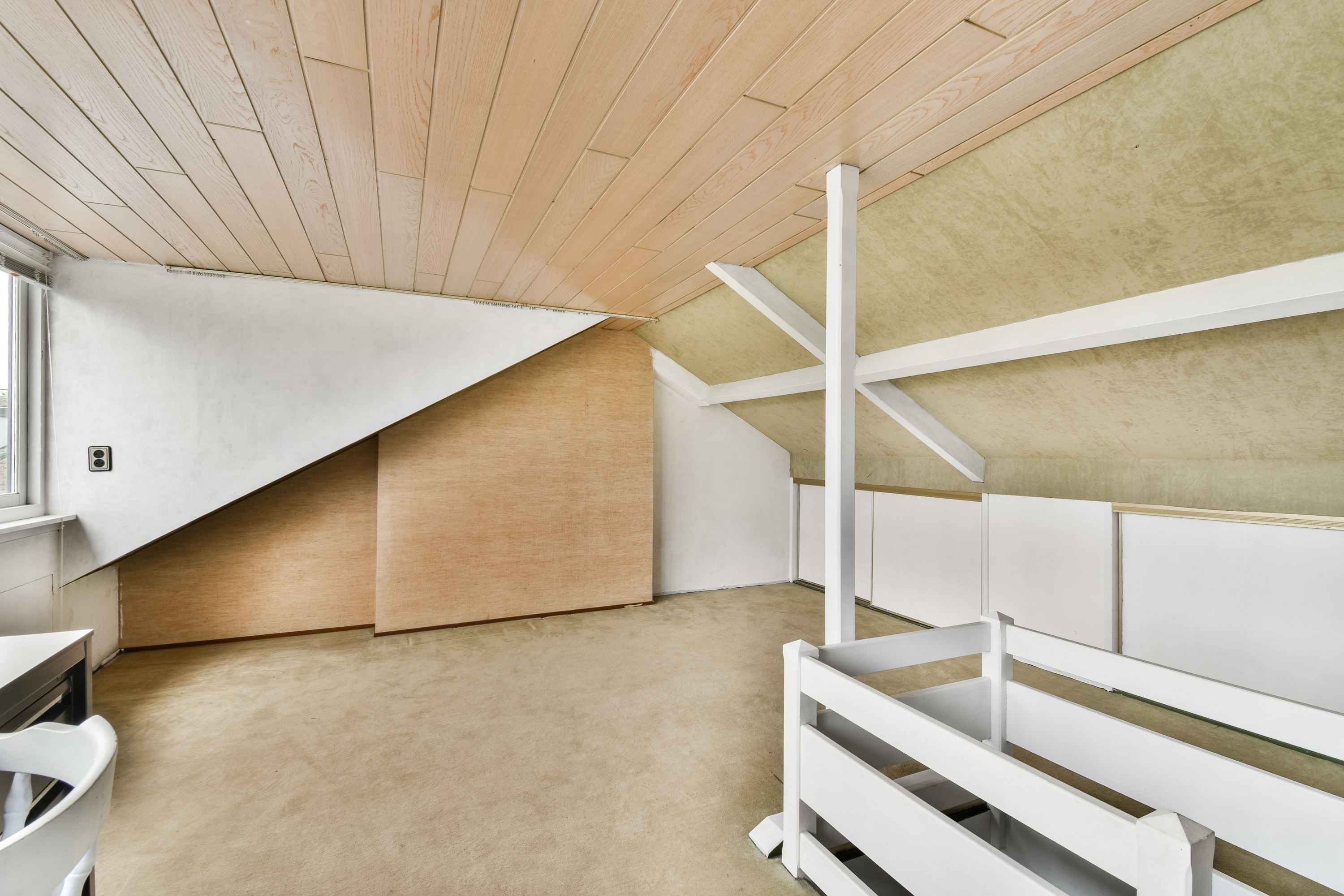 Ruime zolderverdieping met dakkapel en praktische knieschotten, ideaal voor extra bergruimte.