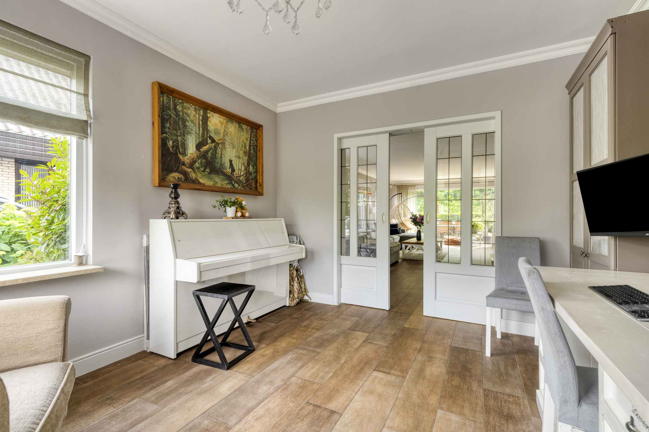 Aan de voorzijde, grenzend aan de woonkamer, zijn er prachtige en-suite deuren naar de werk-/ tv kamer.