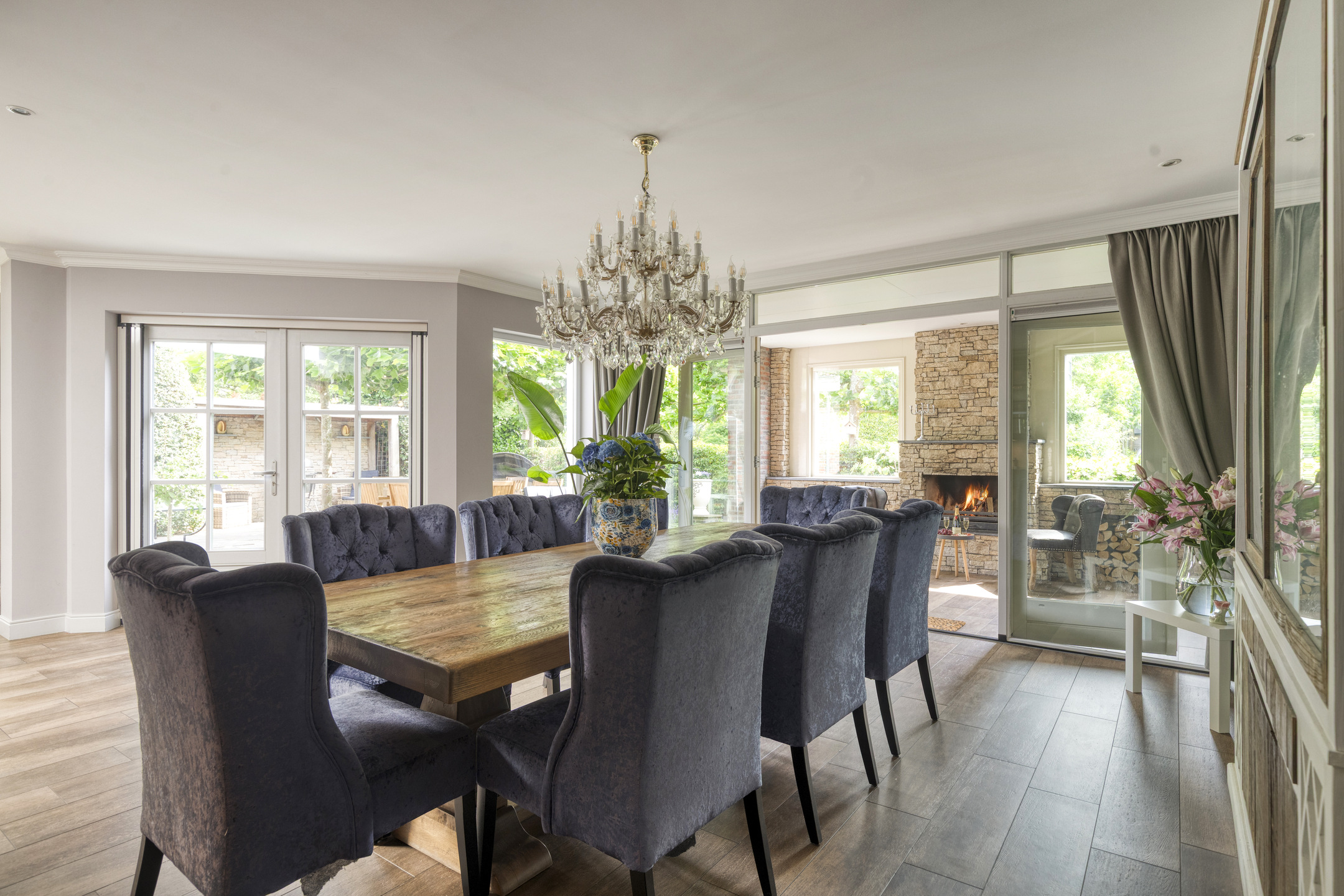 In het verlengde van de keuken bevindt zich de eetkamer met een extra keukenblok met onder andere een extra koelkast en een klimaatkast. Vanuit de eetkamer kom je via openslaande deuren in de veranda met openhaard en is er een deur naar de garage. Ook geven de openslaande deuren toegang geven tot de achtertuin.