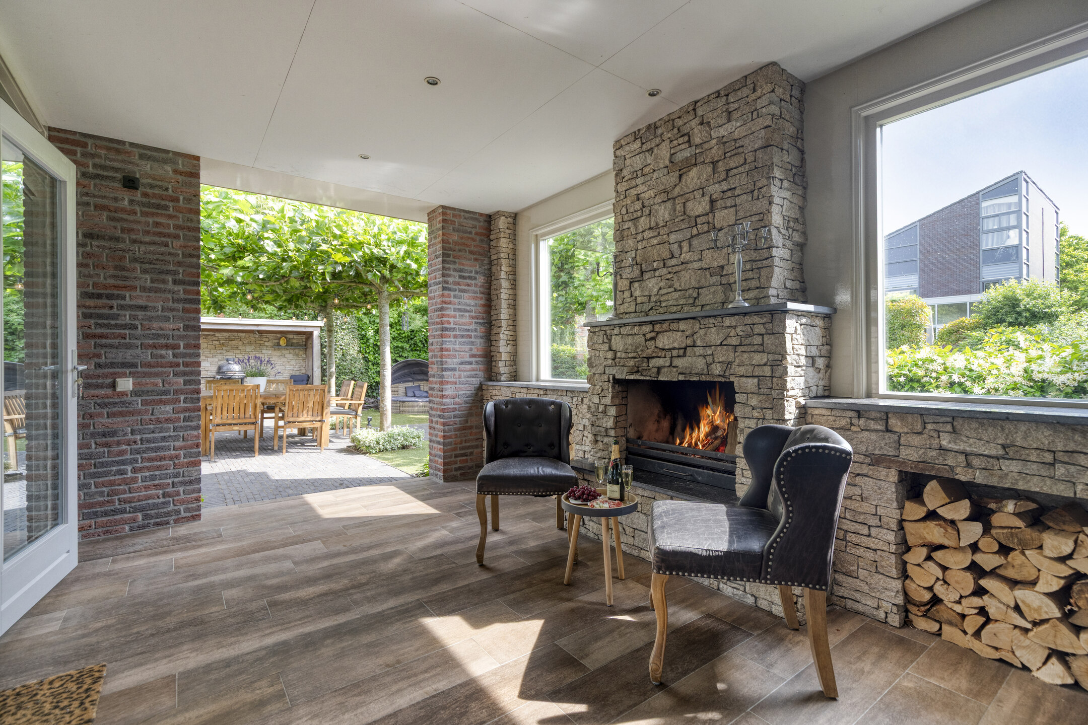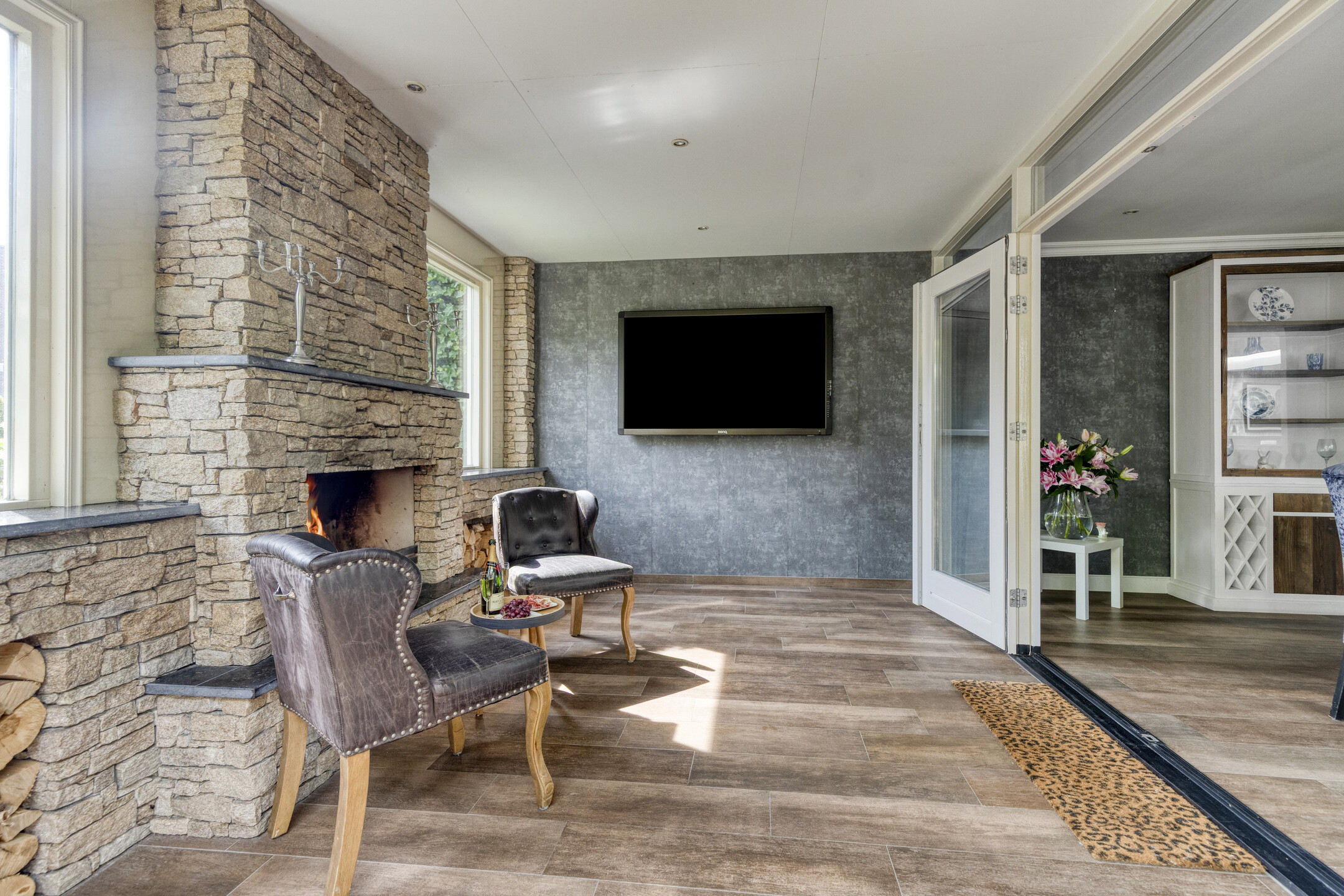 - Ruime living, keuken en eetkamer met sfeervolle veranda met openhaard.