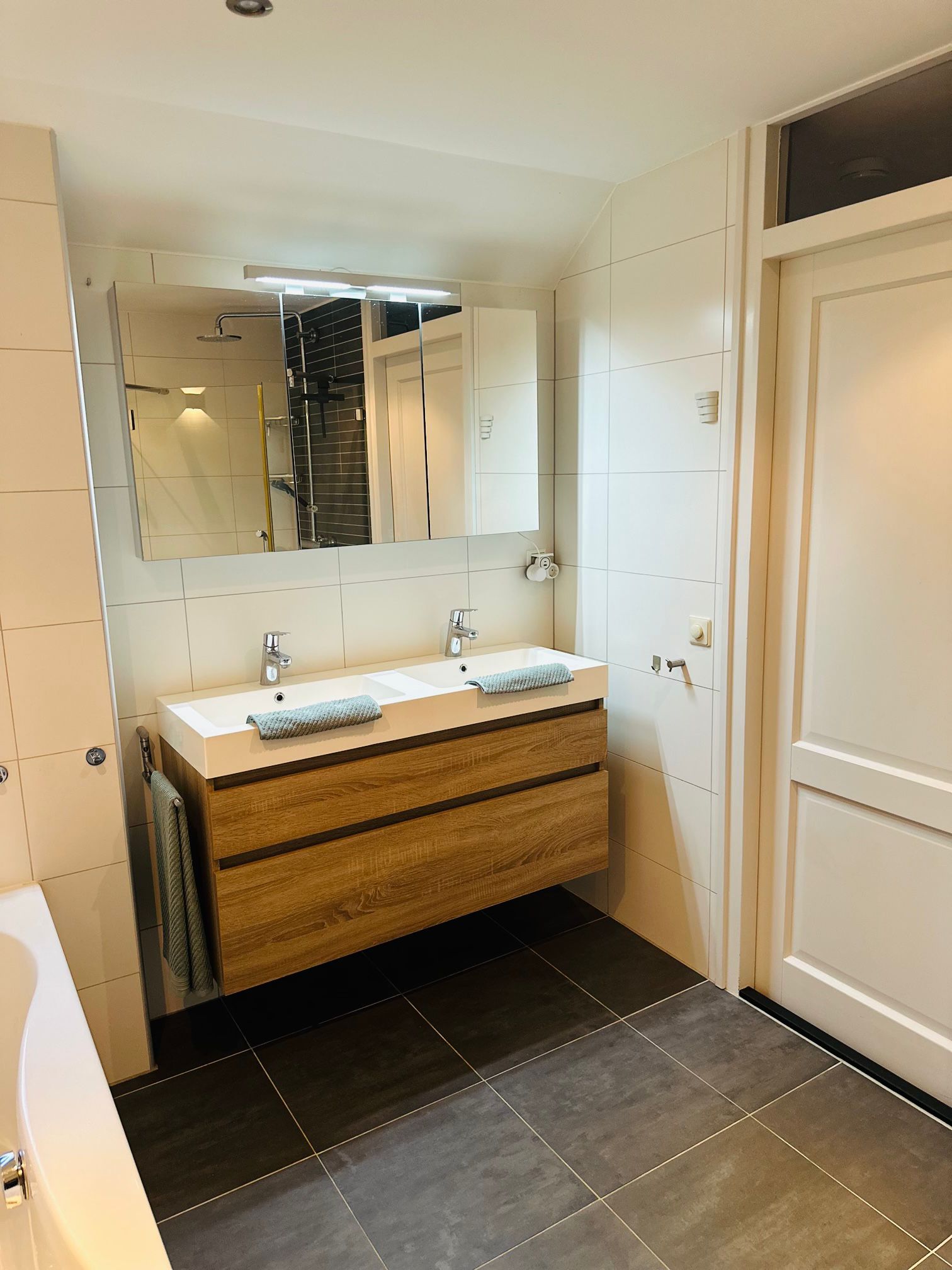 De badkamer is voorzien van een ligbad, toilet, douche en dubbele wastafel.