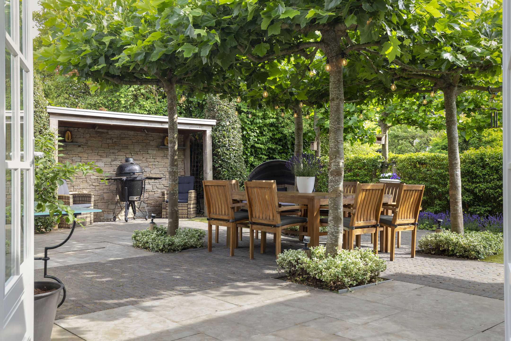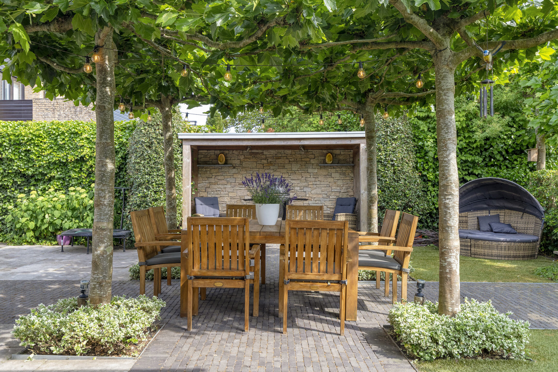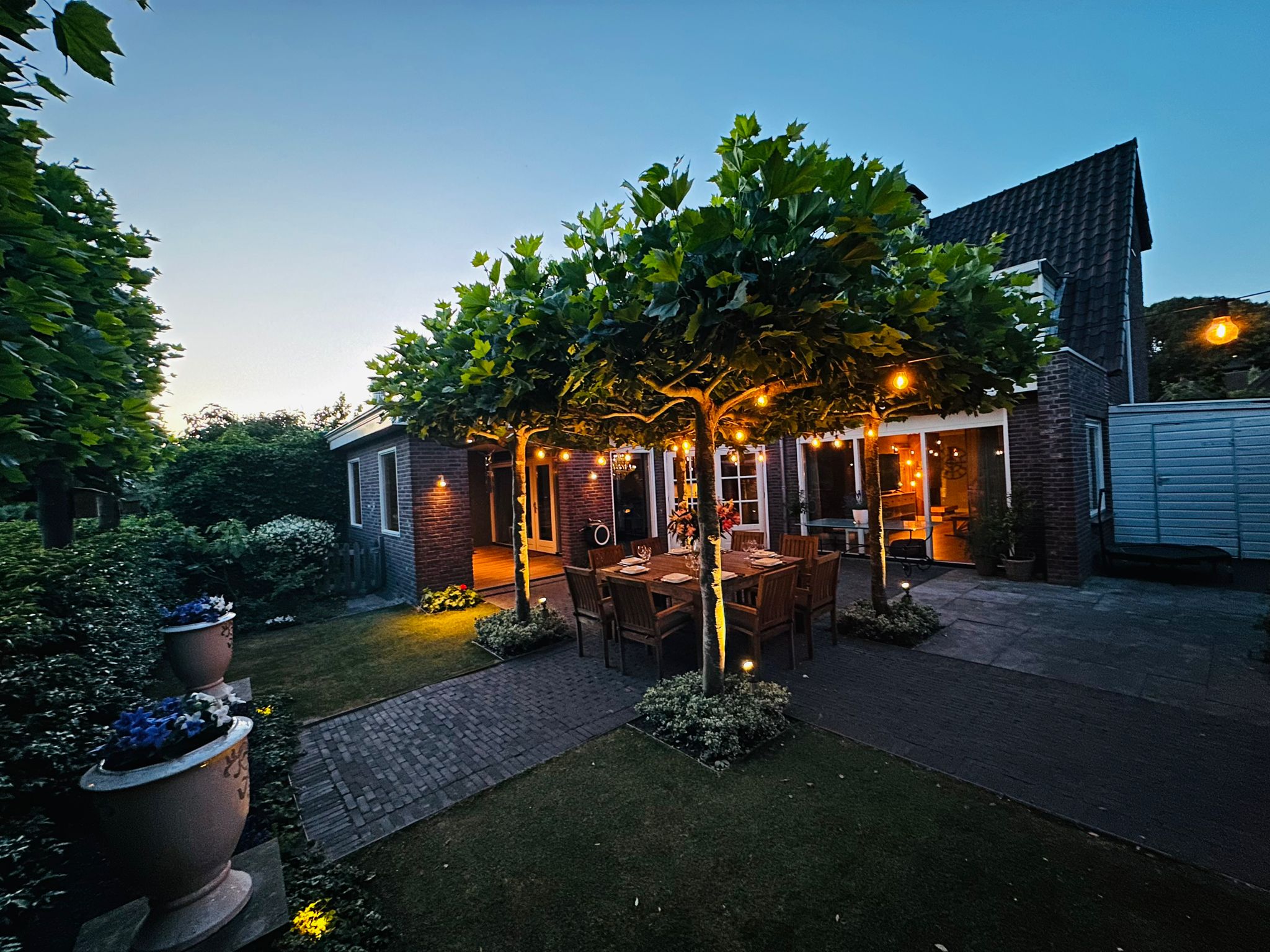 De achtertuin is voorzien van een breed terras met centraal een heerlijke zitplek onder de natuurlijke parasols in de vorm van een viertal dakplatanen. Aan de waterkant is een houten vlonder terras met Jacuzzi.