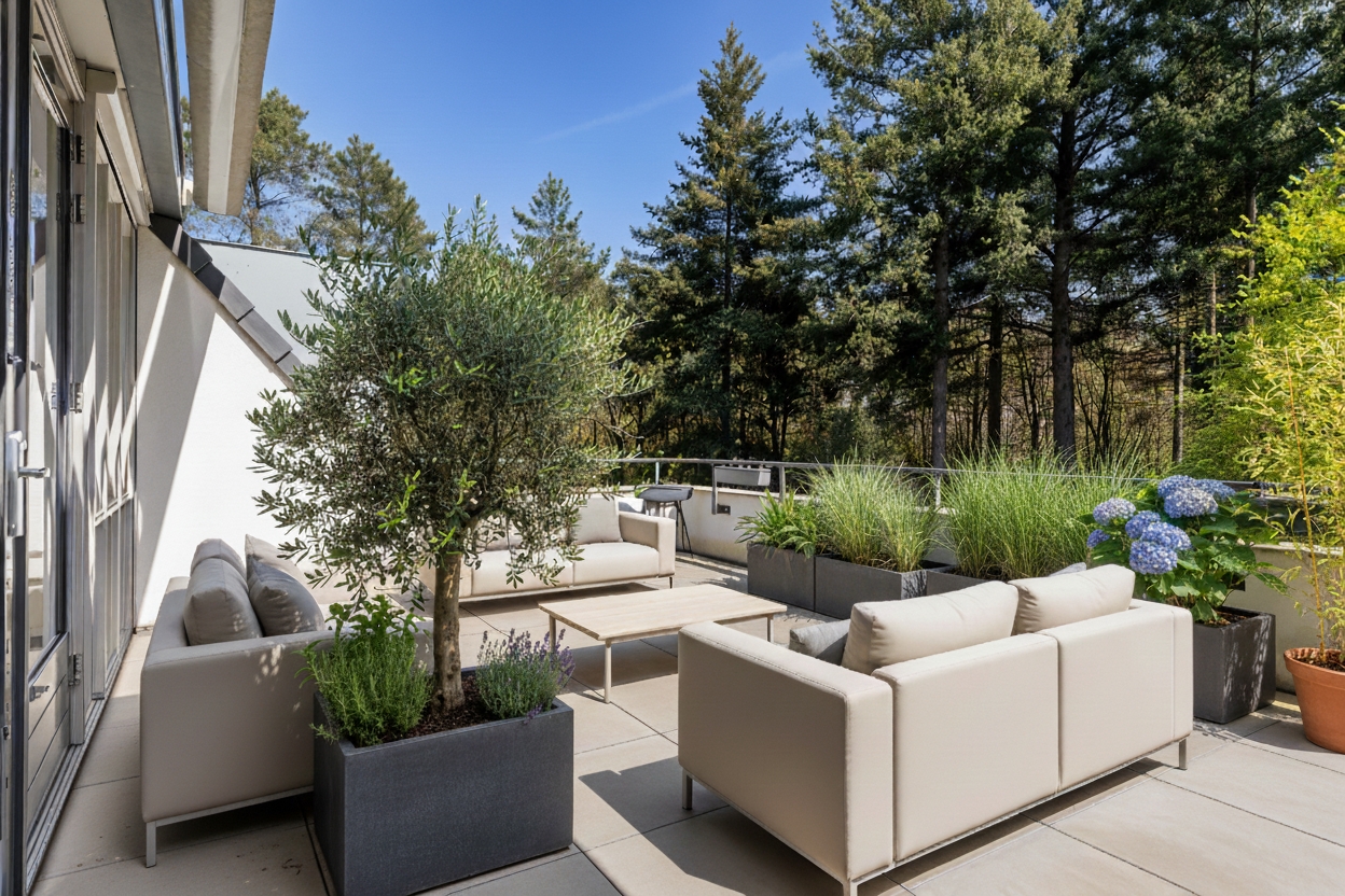 Via twee openslaande deuren bereikt u het riante dakterras van 28 m², gelegen op het zuiden. Hier geniet u de hele dag van de zon en een schitterend uitzicht over het park. Dankzij de royale afmetingen is er ruimte voor een grote loungeset, een eettafel en eventueel een buitenkeuken. Het elektrisch bedienbare zonnescherm met wind- en regensensor zorgt desgewenst voor schaduw.