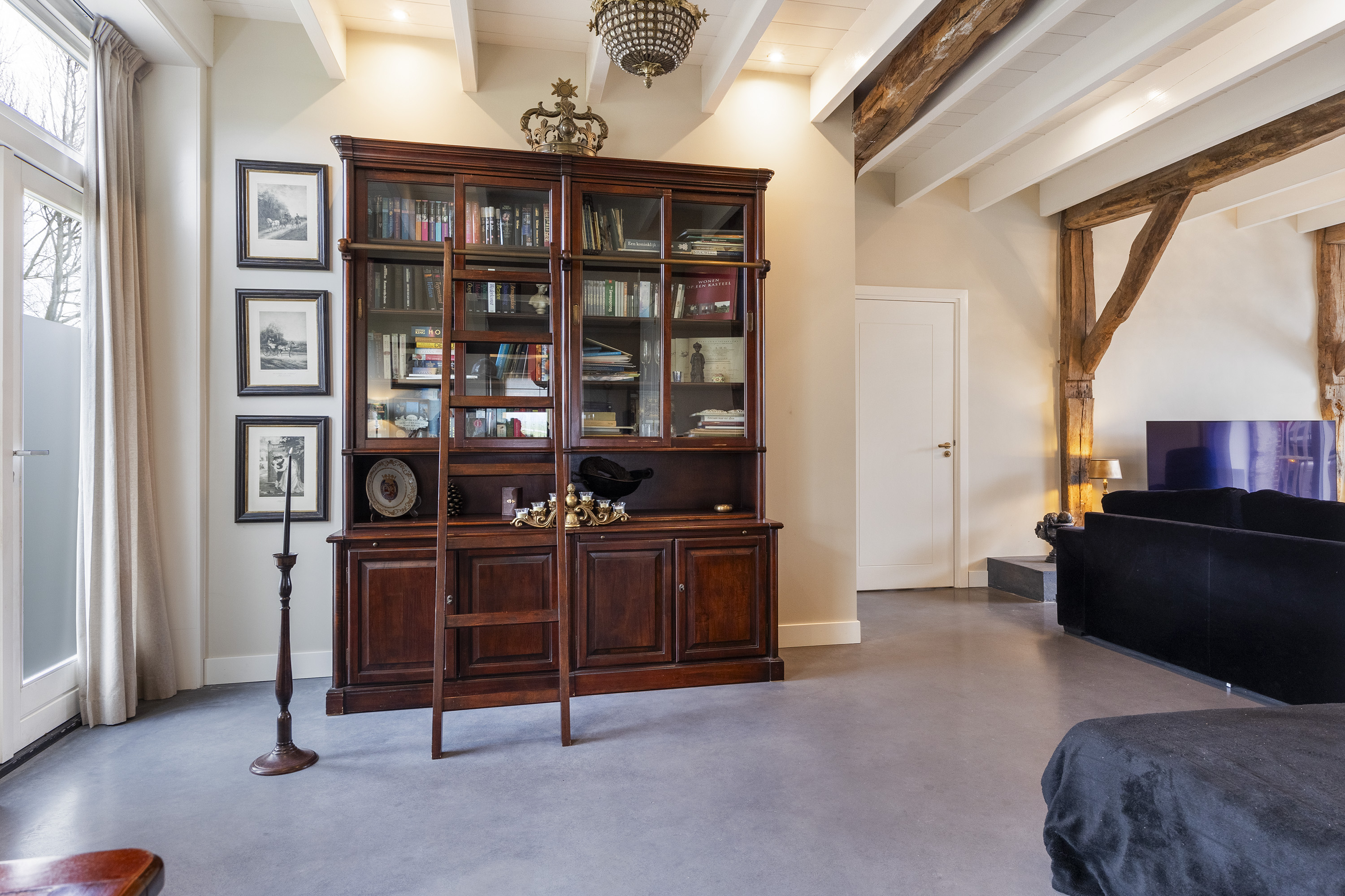 De woonkamer is eveneens royaal opgezet en kenmerkt zich door een prachtige combinatie van witte houten plafondbalken, robuuste draagbalken en een gevlinderde betonvloer. De houthaard en openslaande deuren naar de tuin zorgen voor een natuurlijke verbinding tussen binnen en buiten. De ruimte leent zich uitstekend voor meerdere zitgedeeltes, waardoor een comfortabele en sfeervolle indeling eenvoudig te realiseren is.