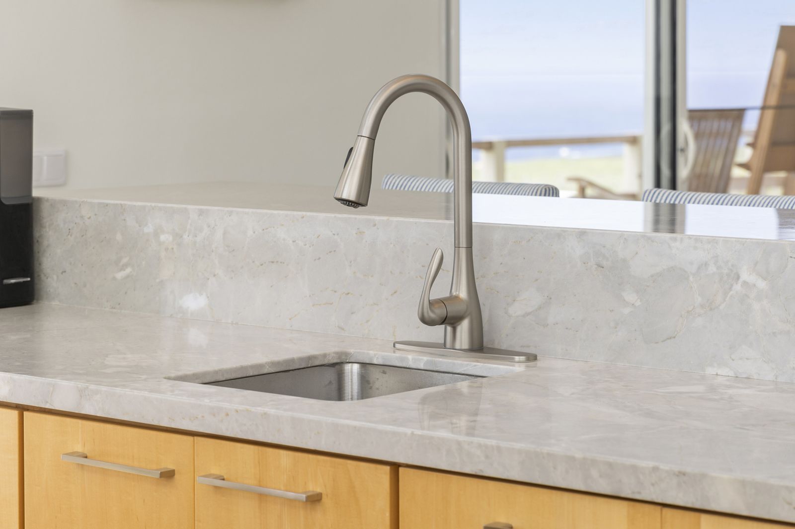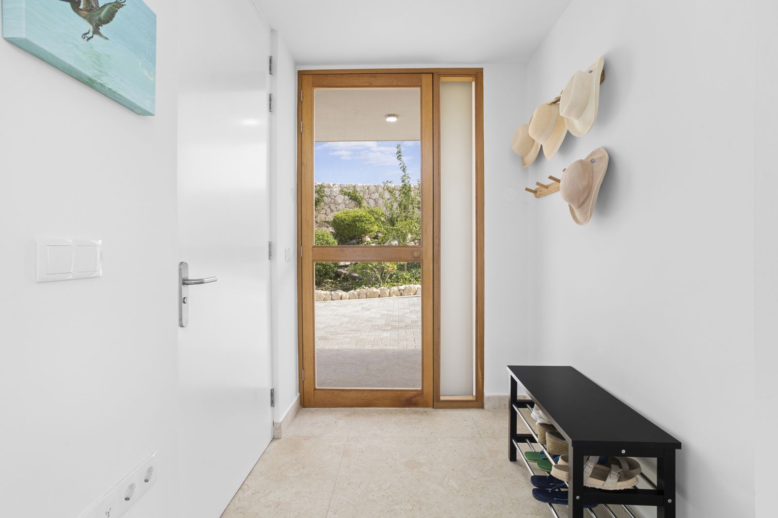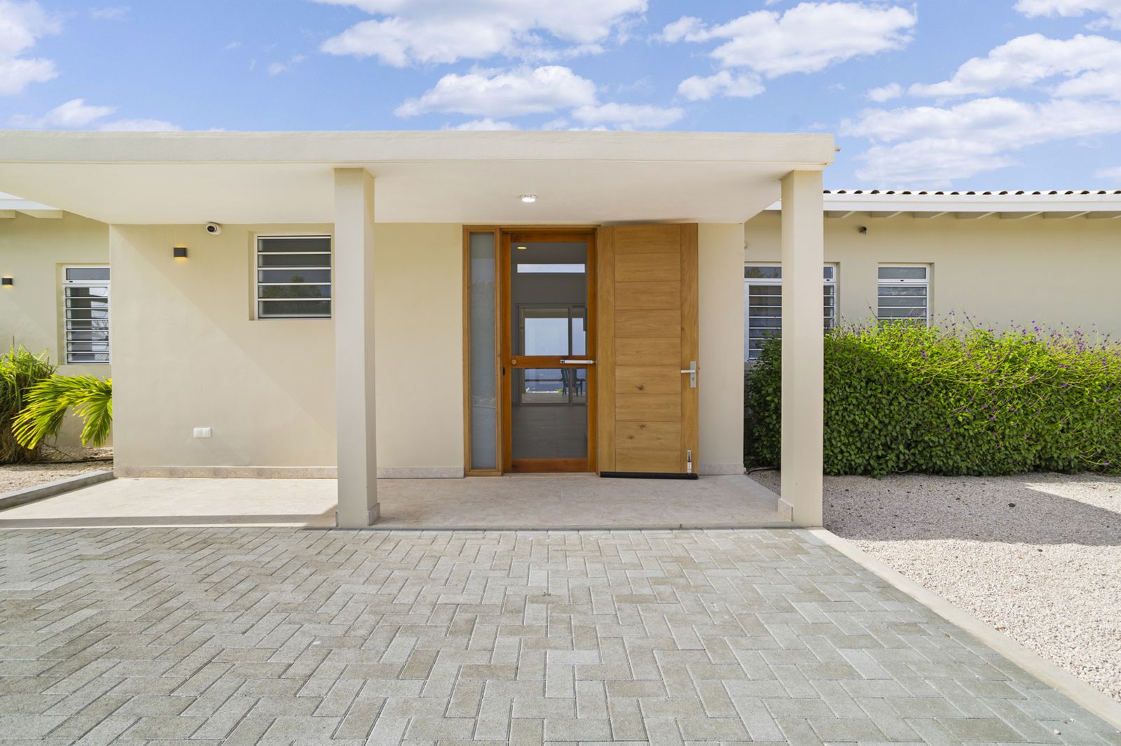De strakke architectuur en grote schuifdeuren zorgen voor een natuurlijke verbinding tussen binnen en buiten. Het ruime terras aan zeezijde vormt een verlengstuk van de leefruimte en vangt de verkoelende passaatwinden, met vrij uitzicht van zonsopgang tot zonsondergang.