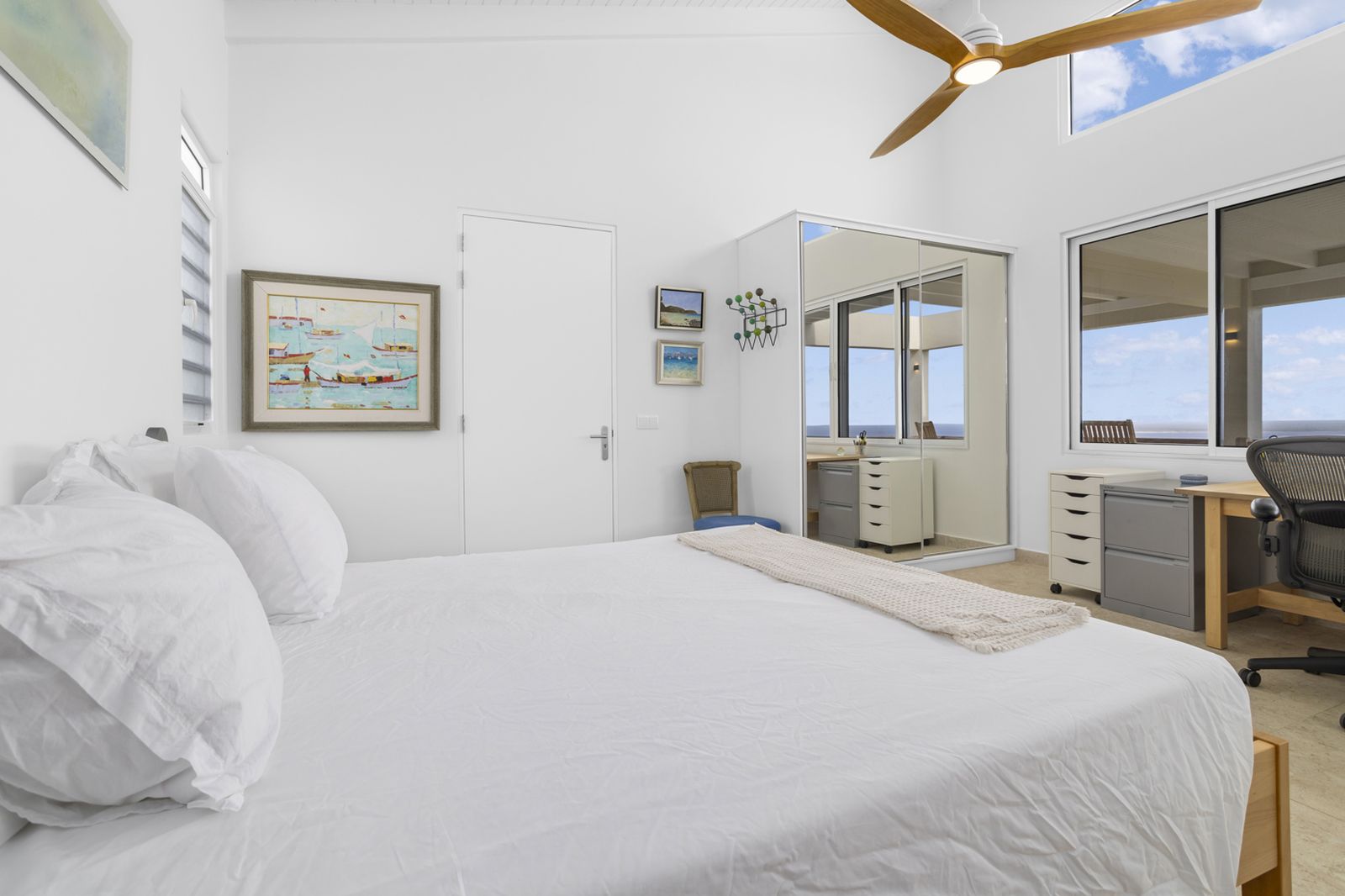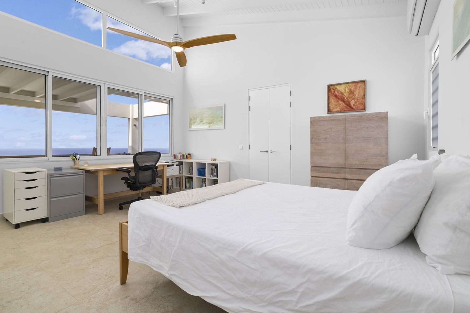 De royale master bedroom heeft direct zeezicht en beschikt over een stijlvolle ensuite badkamer met dubbele wastafel en inloopdouche. De open leefruimtes zijn licht, rustig en onderhoudsvriendelijk, ideaal voor stellen die waarde hechten aan privacy, eenvoud en comfort, zonder in te leveren op ruimte.