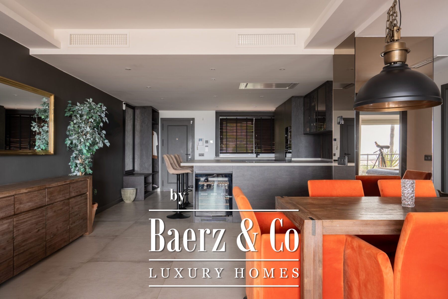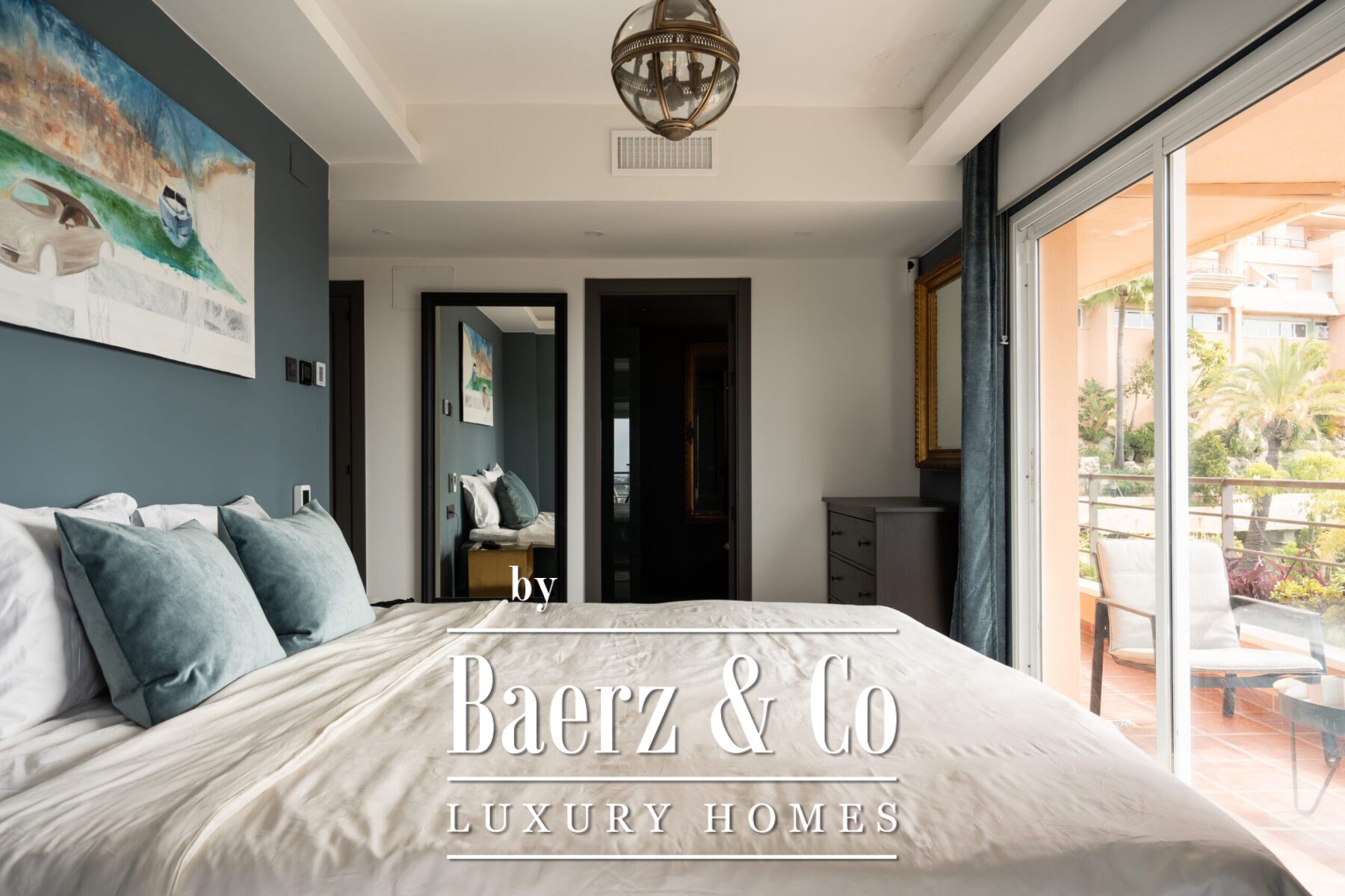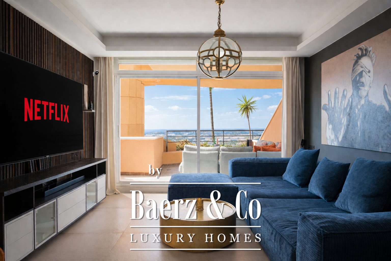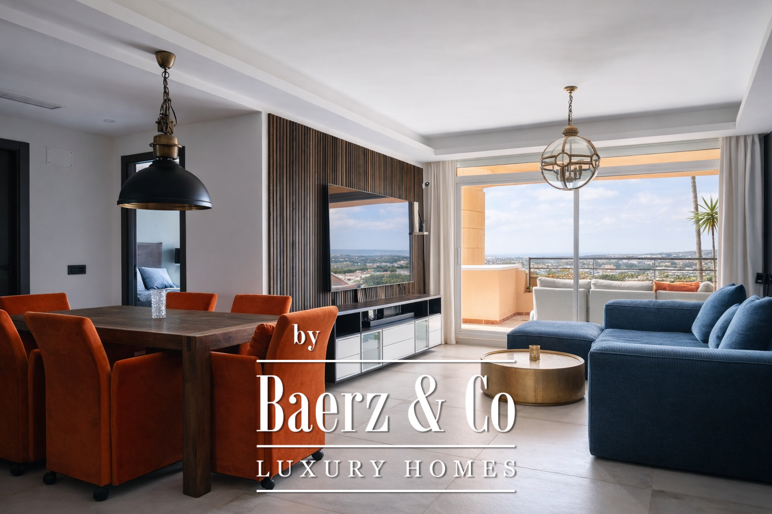 Appartement in Marbella met panoramisch uitzicht op zee en de golfbaan, biedt een recent gerenoveerde leefomgeving ontworpen voor comfort en ingetogen klasse. Dit appartement beschikt over drie slaapkamers en drie badkamers. De open keuken gaat naadloos over in het woongedeelte, dat dankzij de grote schuifdeuren direct grenst aan het royale terras. Daglicht stroomt binnen, terwijl elke slaapkamer directe toegang tot het terras heeft en zo een continu gevoel van ruimte en vrijheid biedt.
