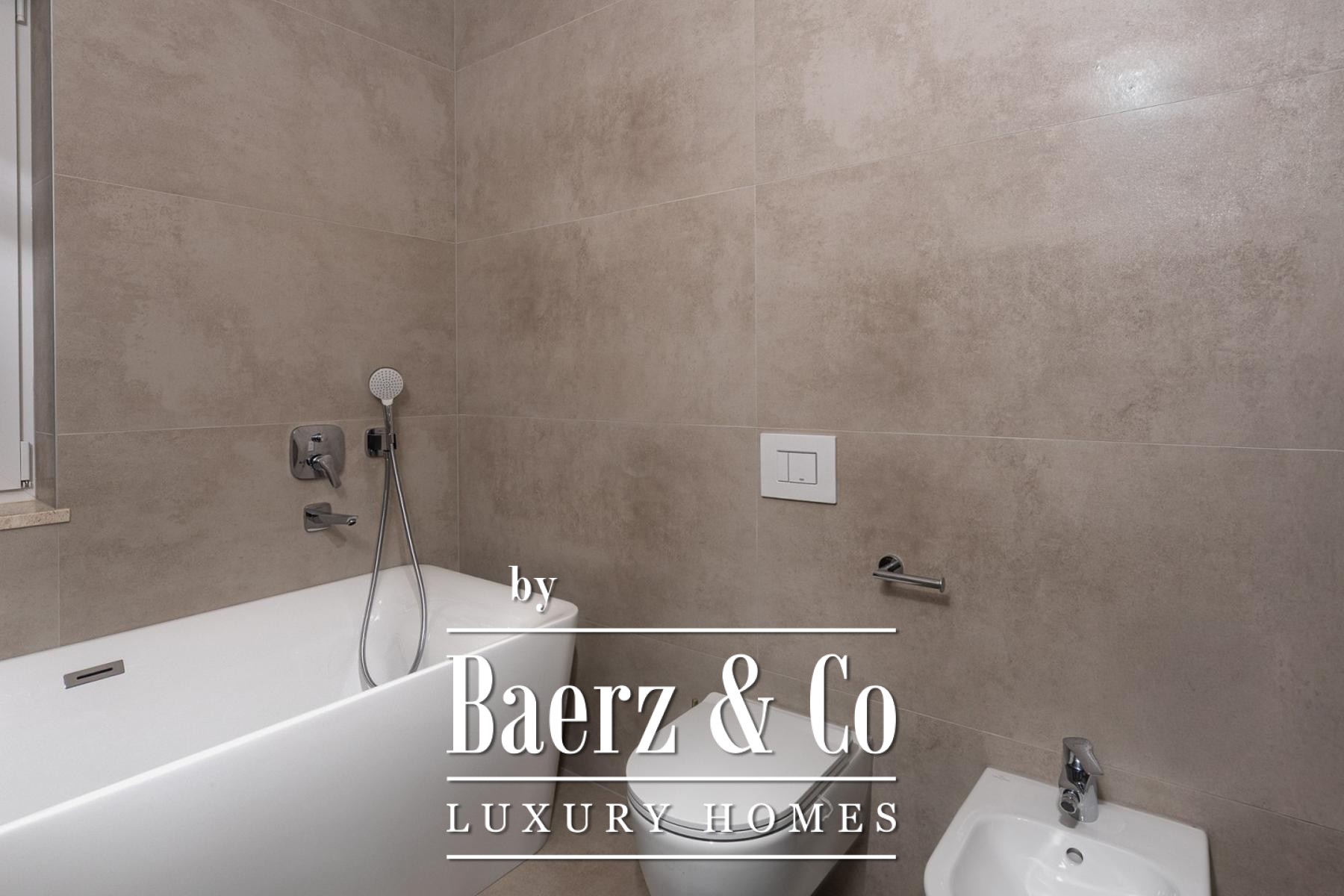 De indeling van de villa is elegant verdeeld over twee verdiepingen. De begane grond omvat een royale woonkamer met grote glazen wanden die overvloedig daglicht binnenlaten en toegang geven tot een overdekt terras. Hiernaast ligt een indrukwekkend zwembad van 3 bij 23 meter, omlijst door de weelderige mediterrane tuin. Een moderne keuken met eethoek, technische ruimte en verfijnd gastentoilet maken deze verdieping compleet, met een open haard die uitnodigt tot sfeervolle avonden.