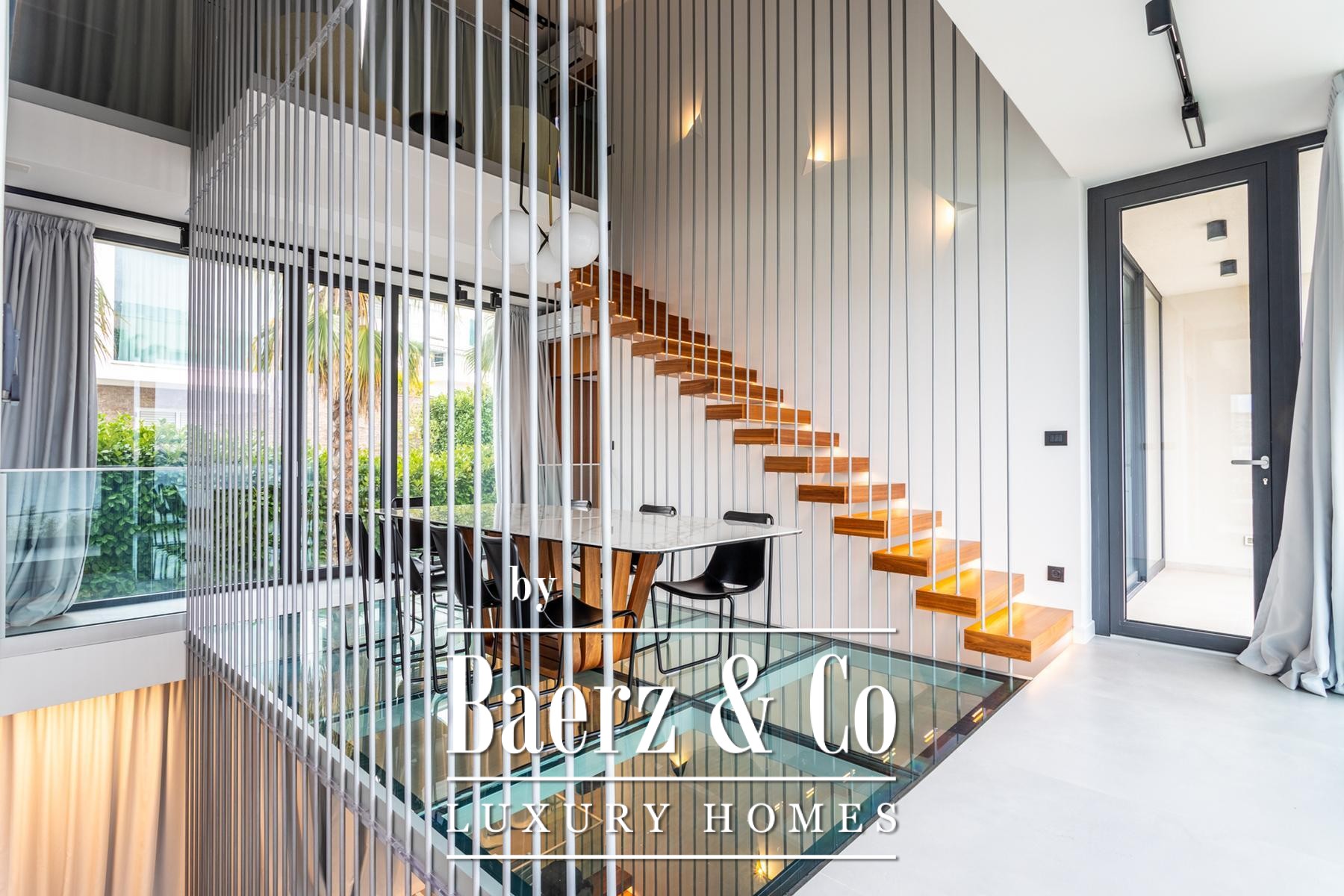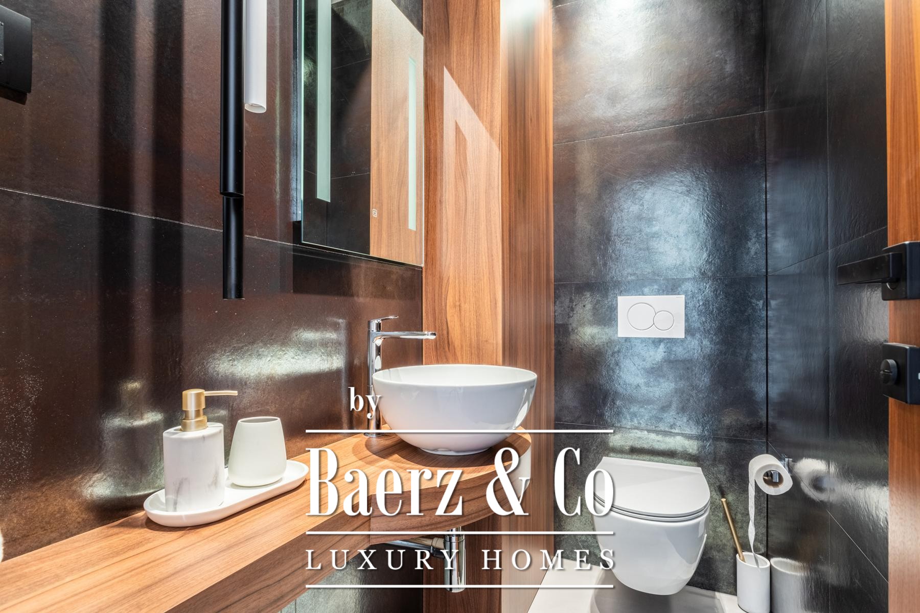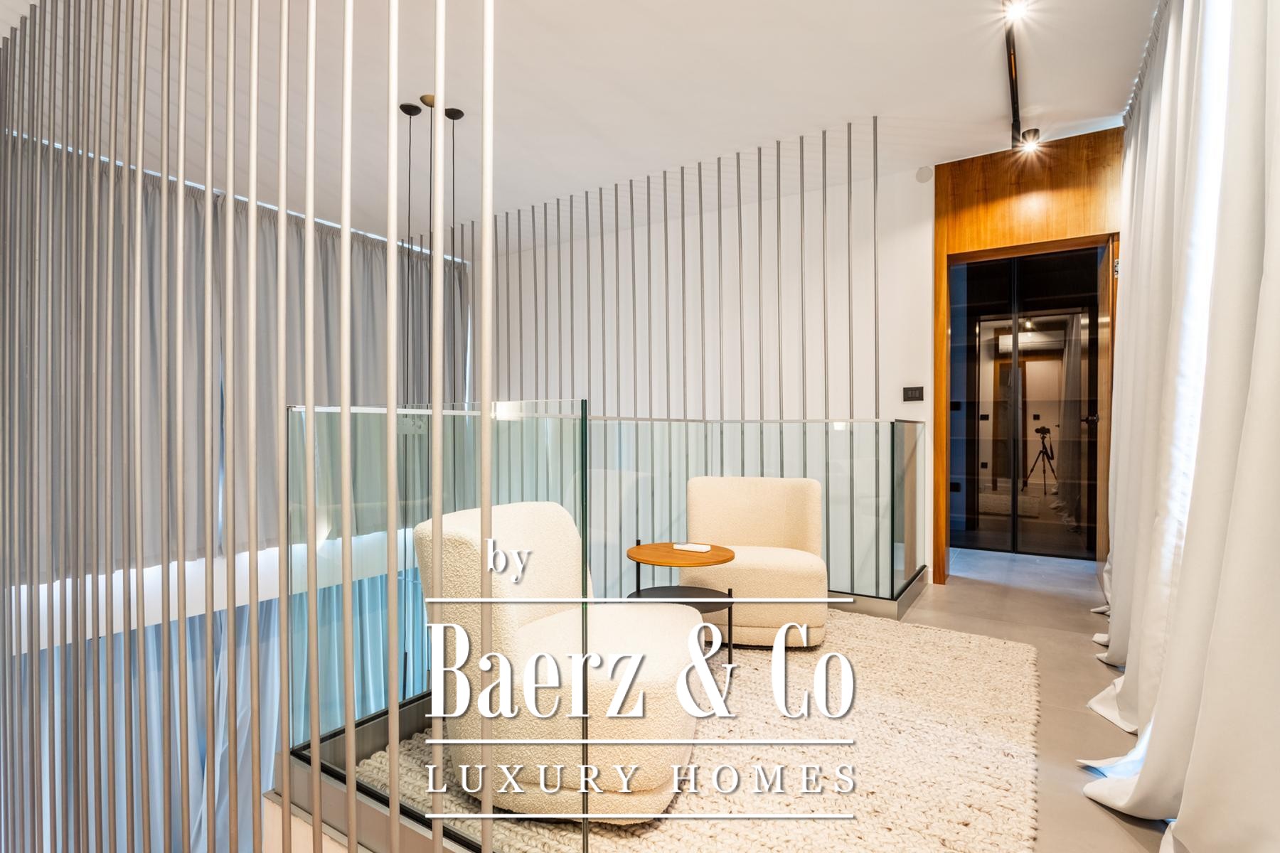 Binnen bieden vier verdiepingen plaats aan vier slaapkamers en vier badkamers. Iedere etage kenmerkt zich door doordacht design, op maat gemaakt meubilair en verfijnde voorzieningen. Het souterrain is volledig ingericht op welzijn en ontspanning en omvat een wijnkelder, sauna, speelkamer, fitnessruimte en wasruimte. Dit voegt een ingetogen gevoel van luxe toe aan het dagelijkse leven. De begane grond grenst aan een terras met privézwembad en zonneterras, terwijl de bovenste verdiepingen beschikken over een eigentijdse keuken, eetruimte en een royale woonkamer met directe toegang tot het balkon.