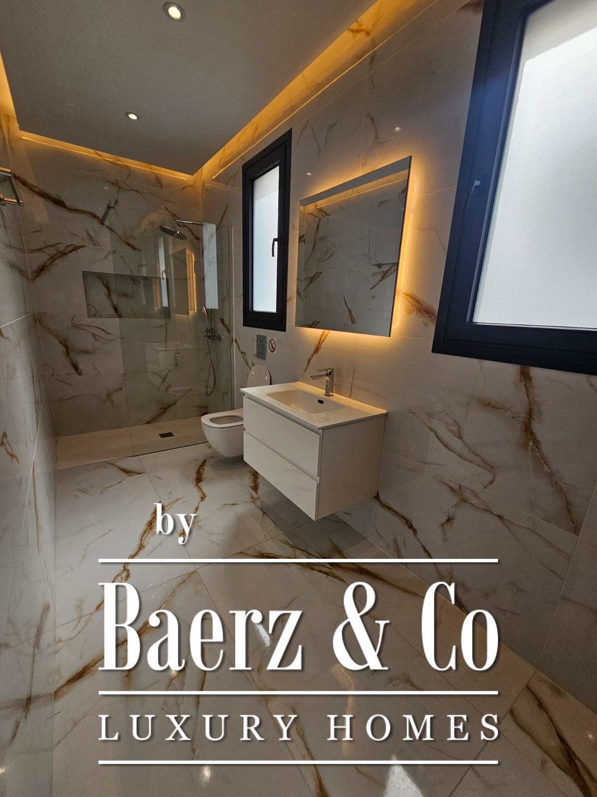 De primaire leefruimtes zijn georiënteerd op maximale lichtinval en het ontwerp voorziet in vier slaapkamers, drie badkamers en twee gastentoiletten. Hoogwaardige materialen omvatten tegelvloeren en aluminium, dubbel beglaasde, energiezuinige ramen. Vloerverwarming, airconditioning, een ventilatiesysteem en geluids- en warmte-isolatie zorgen voor comfort in elk seizoen. Een interne lift en trap verbinden alle verdiepingen en benadrukken het gemak en de toegankelijkheid.