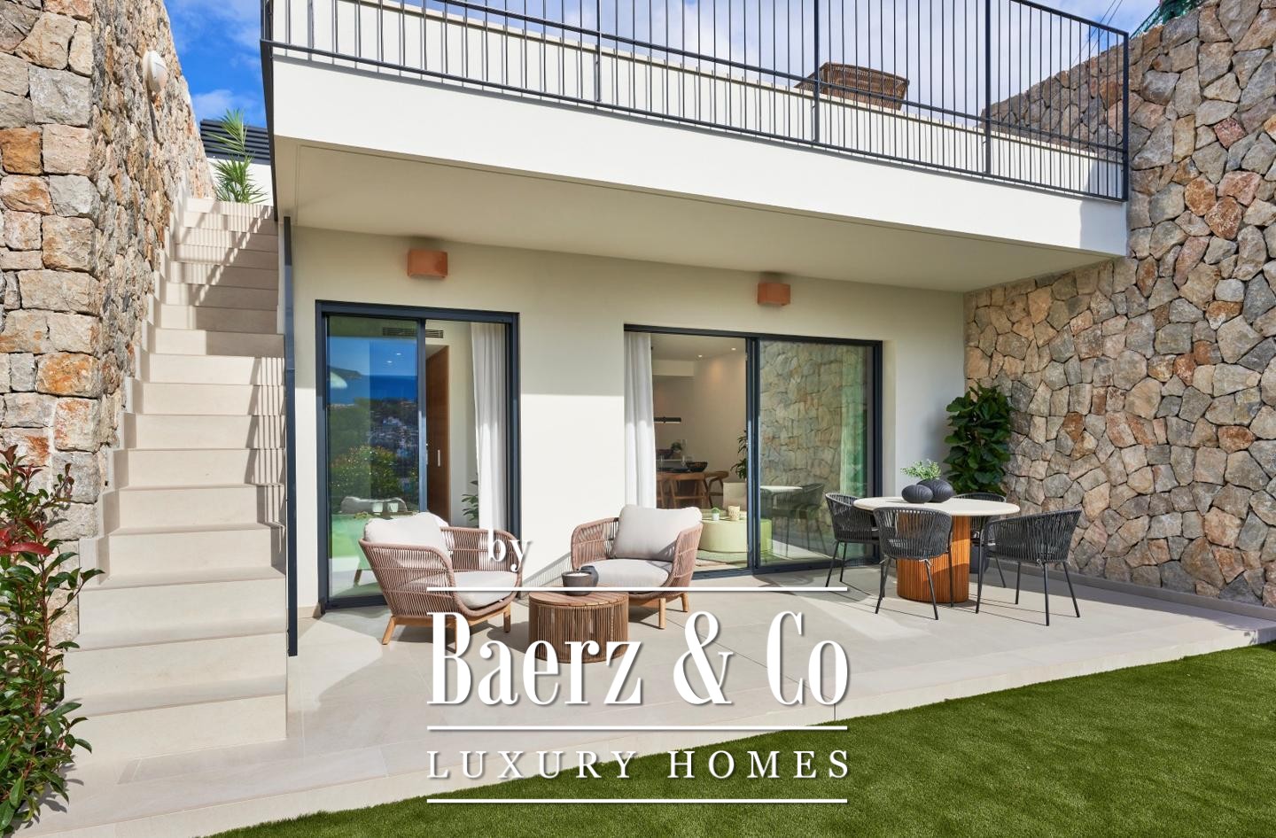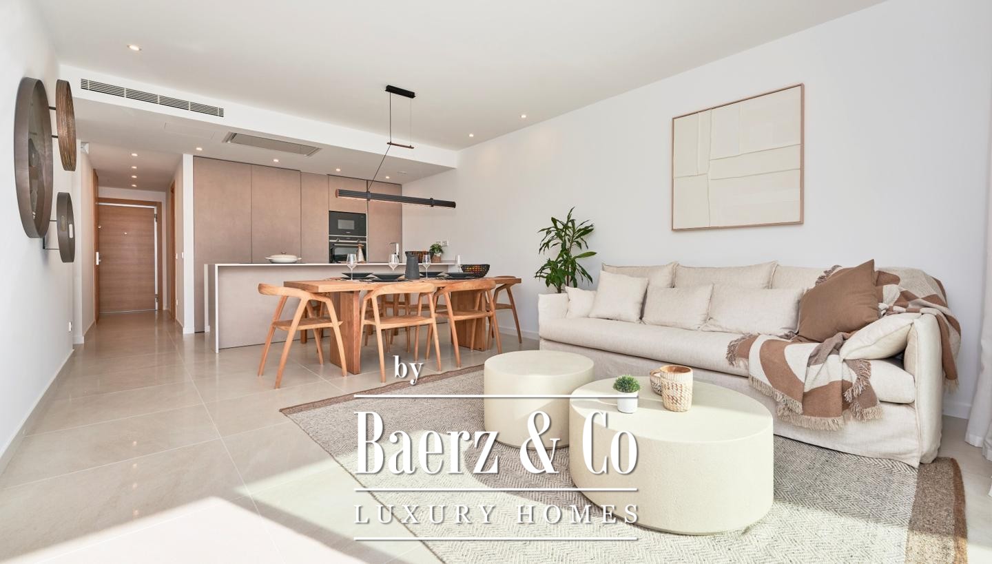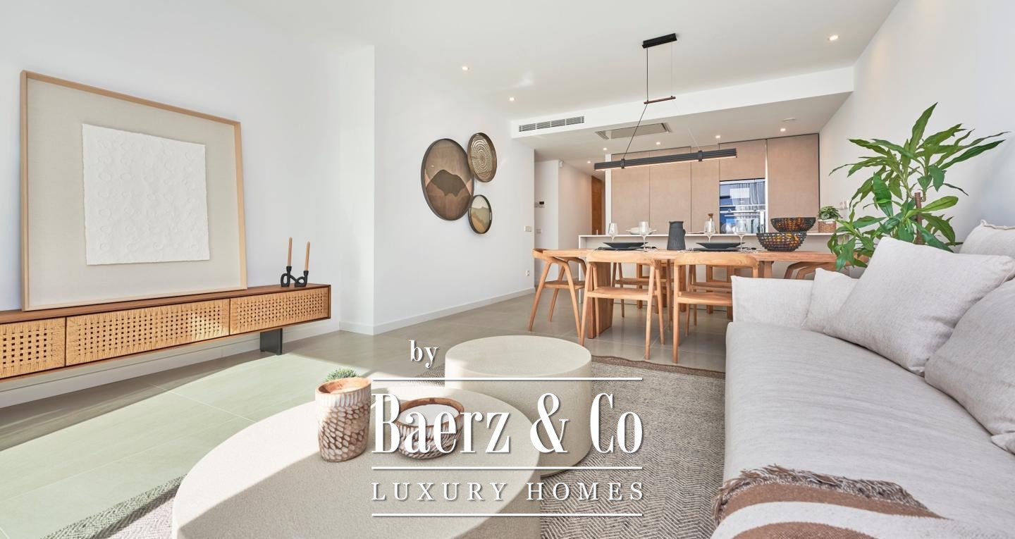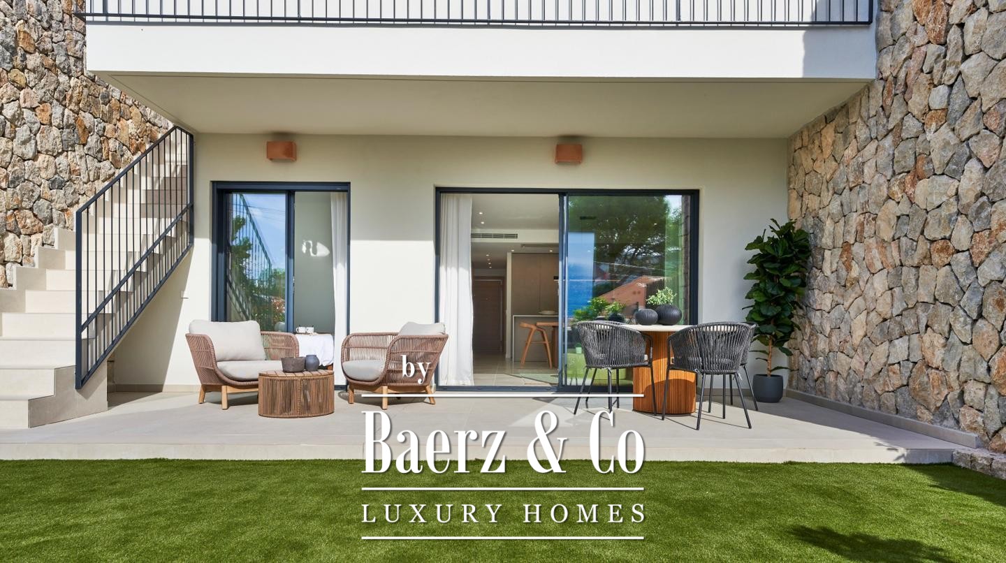 De afwerking is eigentijds en tijdloos tegelijk, met hoogwaardige materialen zoals een Silestone keukenblad, Siemens-apparatuur, massief houten deuren, aluminium ramen met dubbele beglazing, tegelvloeren, vloerverwarming in de badkamers en airconditioning via een lucht-luchtsysteem. De gemeenschappelijke voorzieningen omvatten een zwembad, royale buitenruimtes en privé carports. Met gedeeltelijk zeezicht, energielabel A en op korte loopafstand van strandrestaurants en winkels, ligt dit appartement rustig tegenover Sa Dragonera, omgeven door sereniteit en authentiek mediterraans karakter.