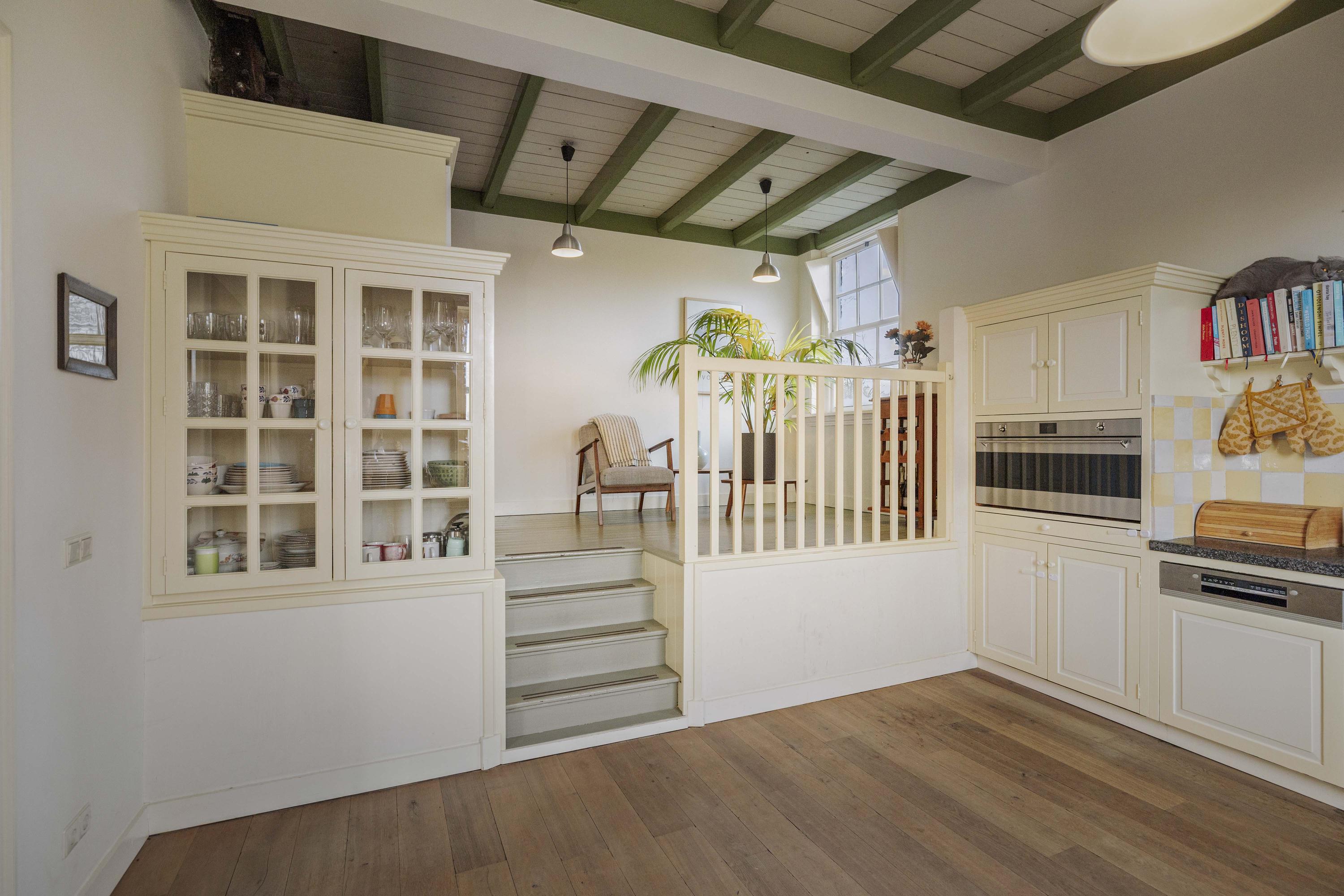 De keuken, met knusse opkamer, strookt qua look-and-feel helemaal met de nostalgie die het huis ademt, maar is verrassend modern en van alle gemakken voorzien; een keuken voor fijnproevers! De handgemaakte keuken is uitgerust met crèmekleurige houten fronten – er is hier veel bergruimte - en een werkblad van gezoete hardsteen. Koken gebeurt hier op de extra brede inductieplaat, en ook qua inbouwapparatuur is het piekfijn voor elkaar, met een koelvriescombinatie, een extra brede heteluchtoven (90 cm, SMEG) en een afwasmachine (Bosch). Onder de opkamer bevindt zich de tweede voorraadkelder.