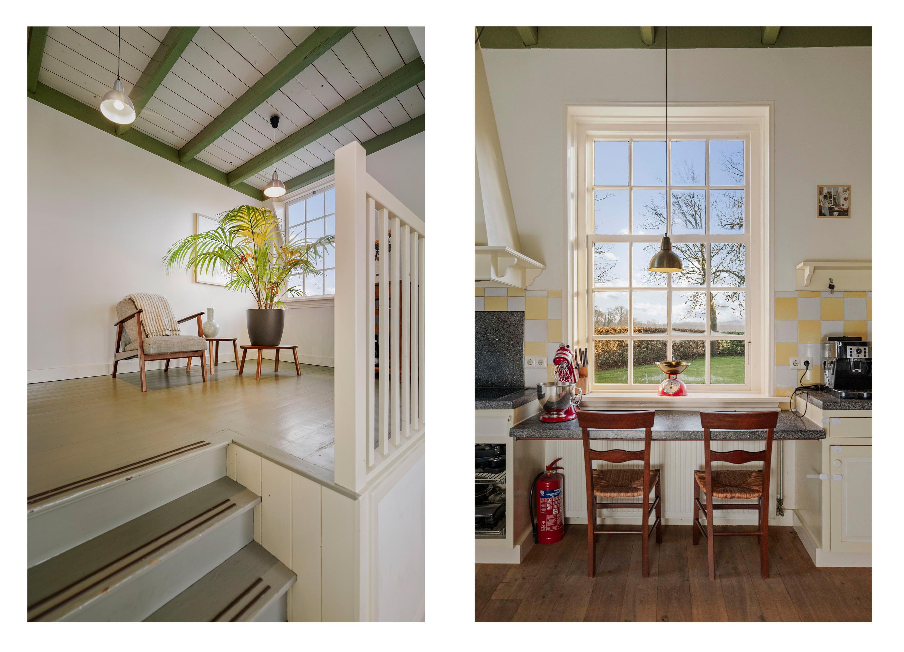 De met grind verharde oprit brengt ons bij de deel. In de Achterhoek is het een goed gebruik om ‘achterom’ binnen te komen en aan de achterzijde van het huis, met de indrukwekkende vergezichten over de belendende landerijen, bevindt zich de entree. In het programma is de klassieke indeling bewaard gebleven, want ook aan de voorzijde bevindt zich de traditionele voordeur. De hal, met de hoge plafonds, is zonnig en royaal, en op de vloer liggen de traditionele estrikken, die zo typerend zijn voor deze streek. De formele hal is voorzien van een Esscher plavuizen vloer en het geheel wordt fraai gecontrasteerd door de friswitte wanden en het roomkleurige houtwerk. In de hal is er toegang tot de WC en de badkamer op de begane grond, de eetkamer, de kelder en de opkamer die nu in gebruik is als kantoor met pantry, maar die ook perfect dienstdoet als gastenkamer.
