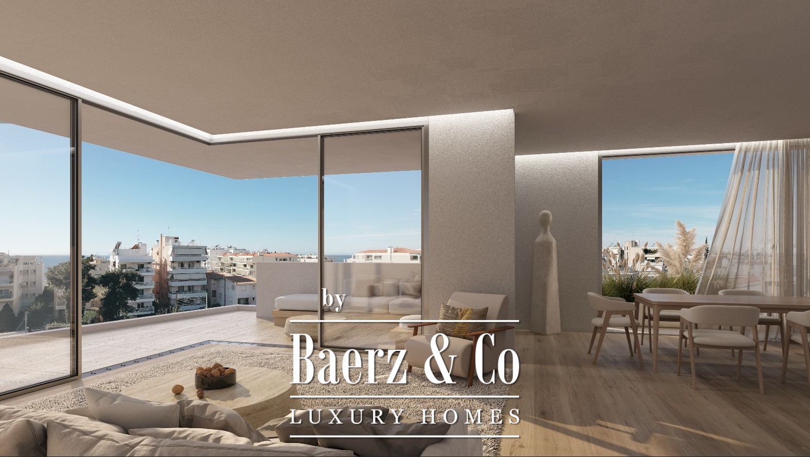 Het appartement beslaat twee zorgvuldig vormgegeven woonlagen, met drie royaal bemeten slaapkamers en vier tot in detail afgewerkte badkamers. Luxe, hoogwaardige materialen geven elk oppervlak een ingetogen elegantie, terwijl grote raampartijen het interieur laten baden in natuurlijk licht, wat de open, luchtige sfeer versterkt en een panoramisch uitzicht biedt op de Egeïsche Zee en de stadslichten.